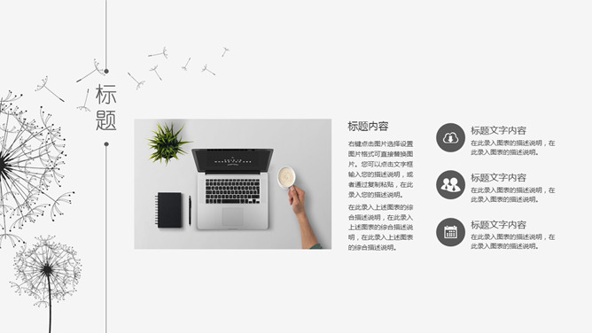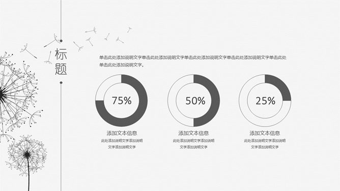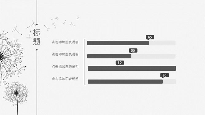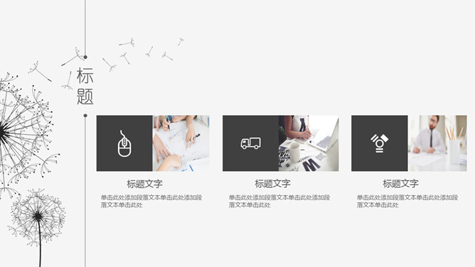 简约素雅蒲公英通用PPT模板。一套简约素雅风格幻灯片模板,黑灰配色,唯美蒲公英素材装饰,通用性强。