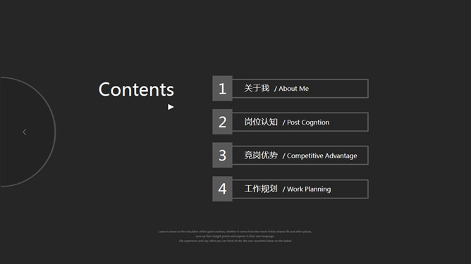 简约黑灰竞聘简历PPT模板。一套求职竞聘个人简历幻灯片模板,黑灰配色,简约素雅大方。