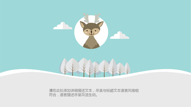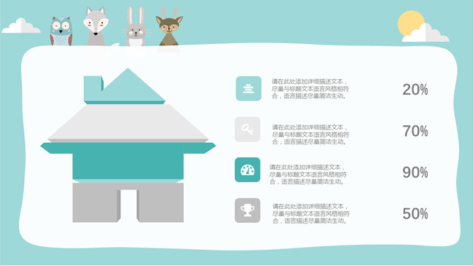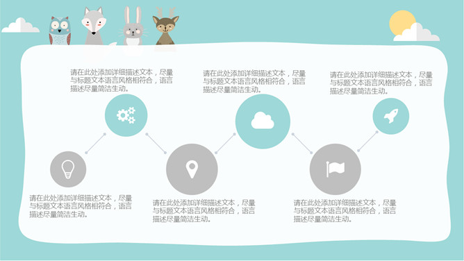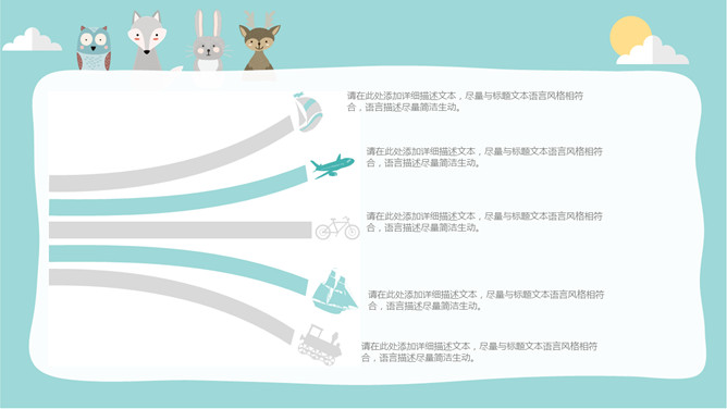 淡雅扁平化可爱卡通PPT模板。一套卡通风格幻灯片模板,淡雅蓝色配色,扁平化设计风格,可爱卡通动物装饰。
