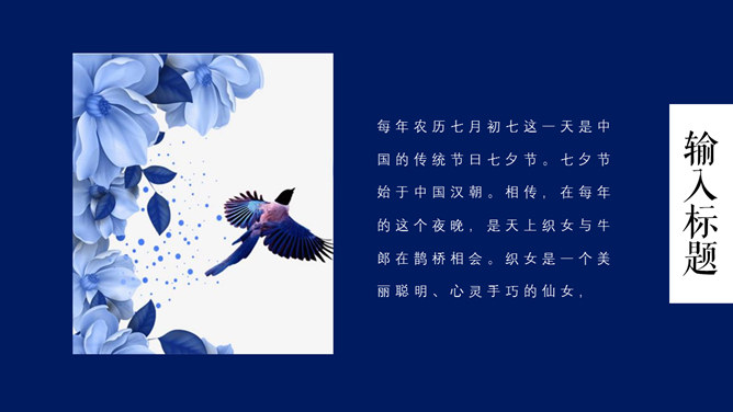 七夕节牛郎织女相会PPT模板。一套设计精美的七夕节幻灯片模板,以古典传说牛郎织女鹊桥相会为主题。