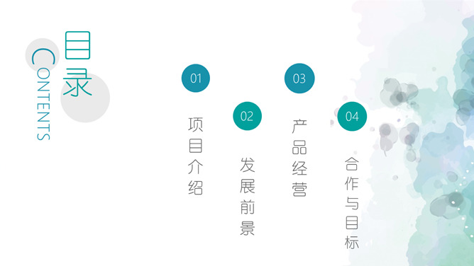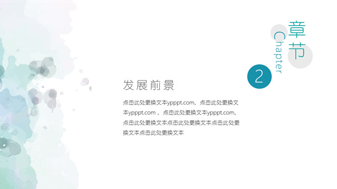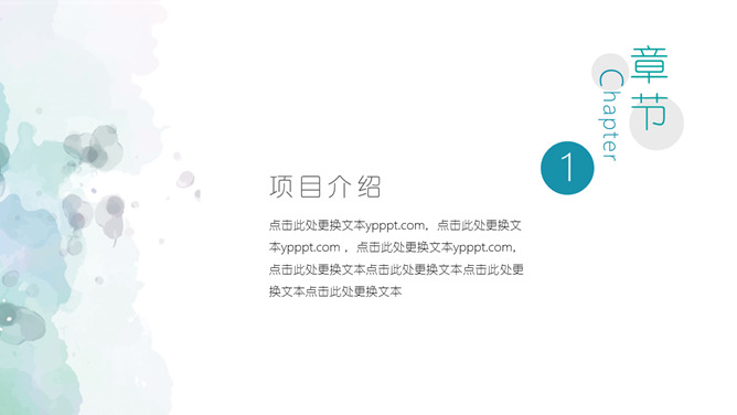 简约清新水彩晕染PPT模板。一套简约通用幻灯片模板,创意水彩斑点晕染效果背景,渐变效果配色。