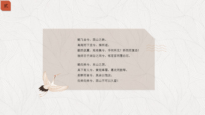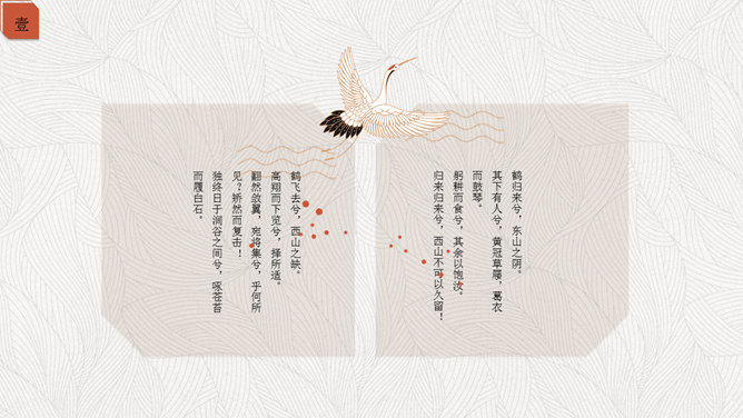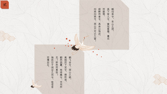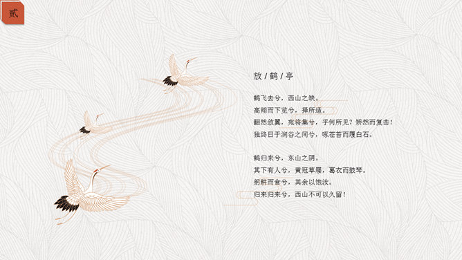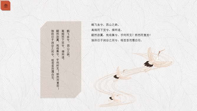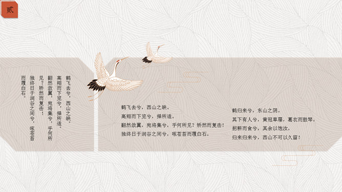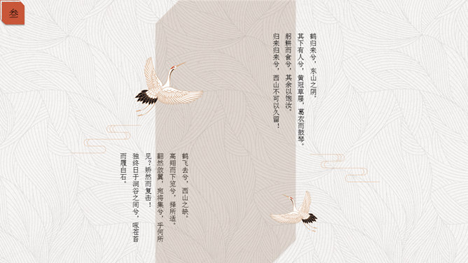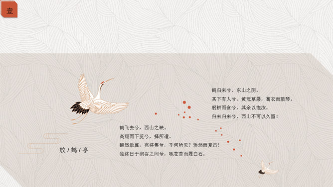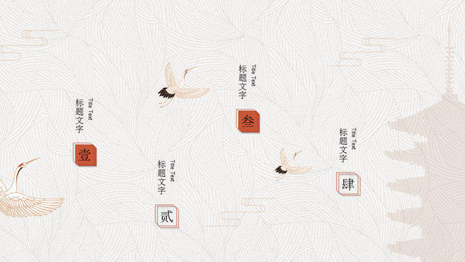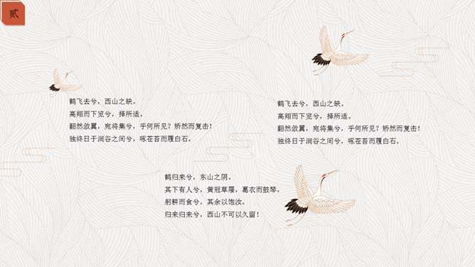 简约典雅仙鹤中国风PPT模板。一套古典中国风幻灯片模板,以仙鹤、云纹等为主要设计元素,简约典雅效果。