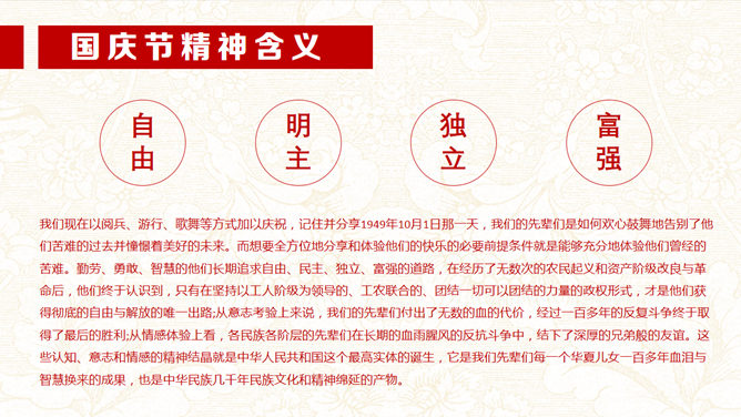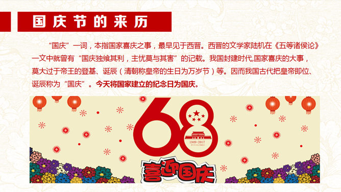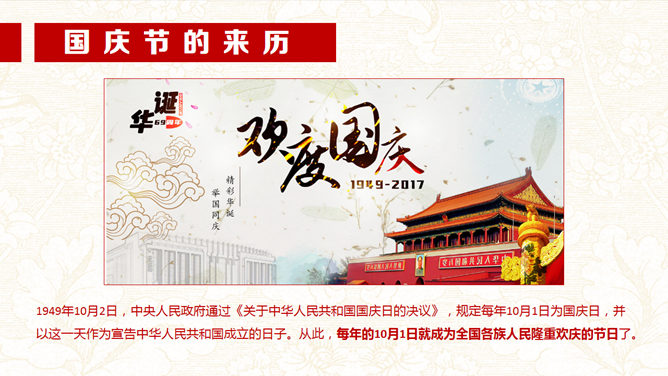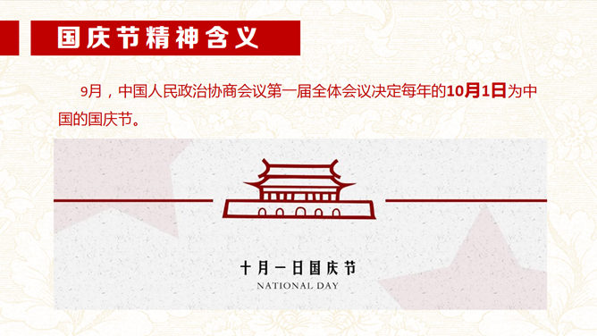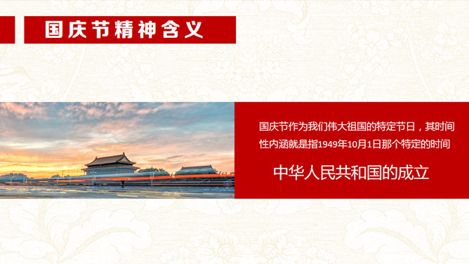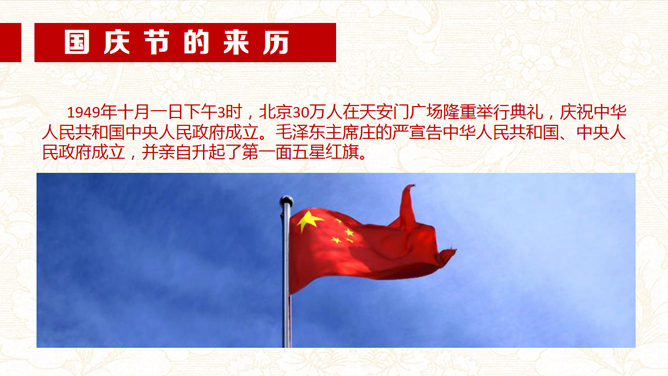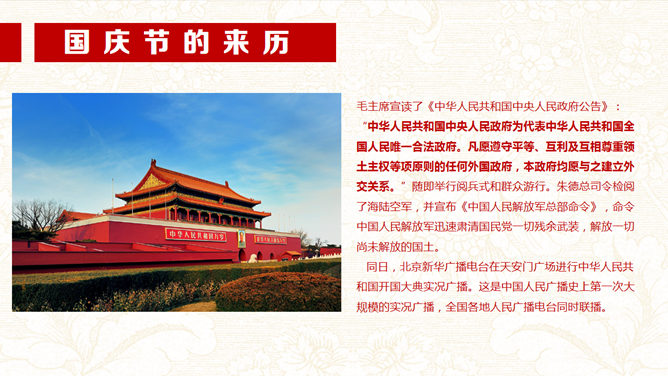 喜迎国庆节PPT模板下载。一套国庆节主题幻灯片模板,大气喜庆红色主色调,图文排版为主,动态播放。