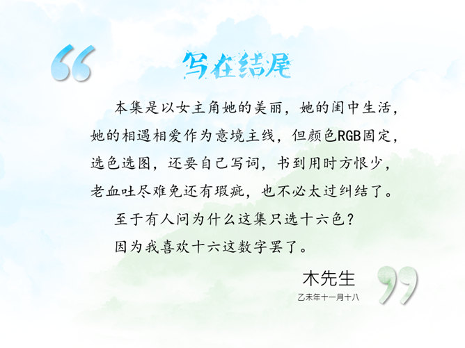 本集是以女主角她的美丽,她的闺中生活,她的相遇相爱作为意境主线,但颜色RGB固定,选色选图,还要自己写词,书到用时方恨少,老血吐尽难免还有瑕疵,也不必太过纠结了。至于有人问为什么这集只选十六色?因为我喜欢十六这数字罢了。