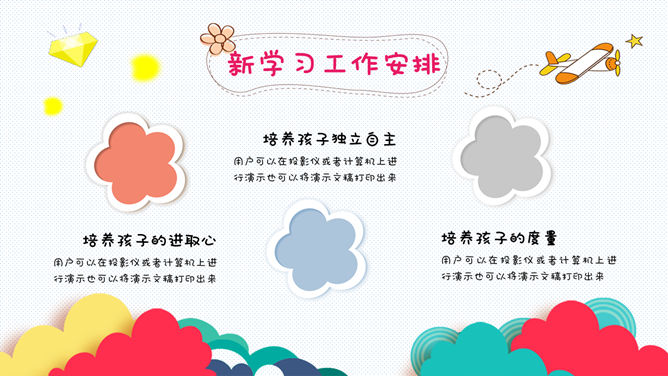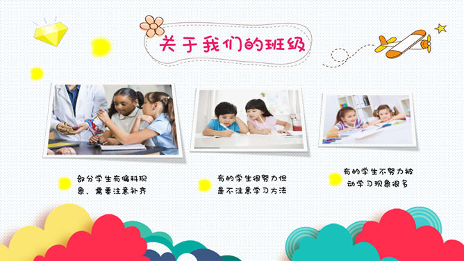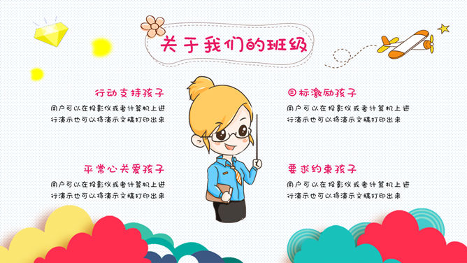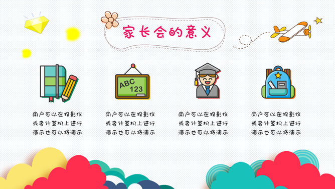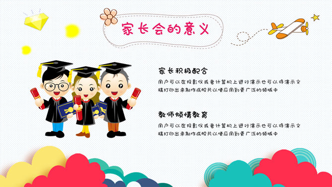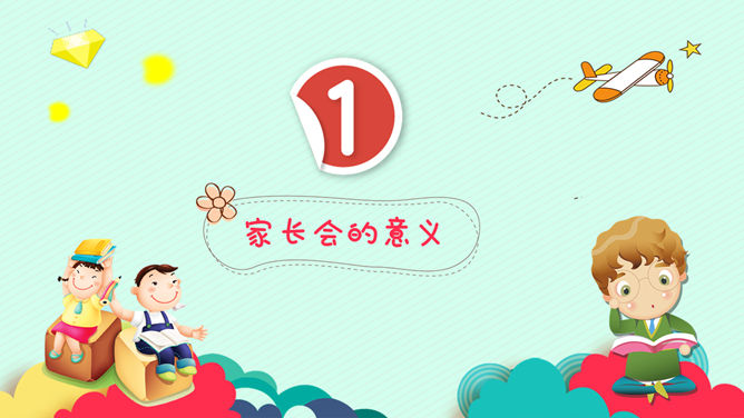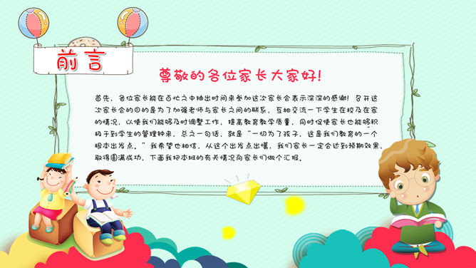 卡通幼儿园家长会PPT模板。一套实用精美的幼儿园家长会幻灯片模板,可爱卡通风格。建议安装字体: