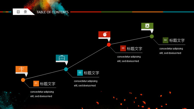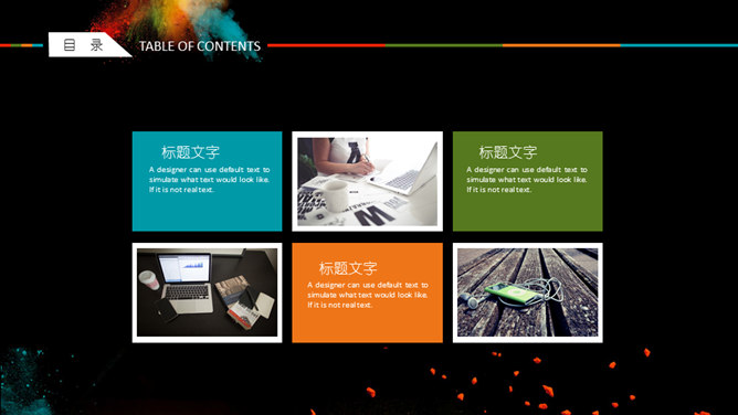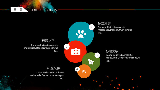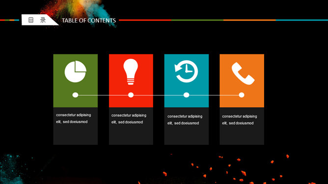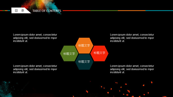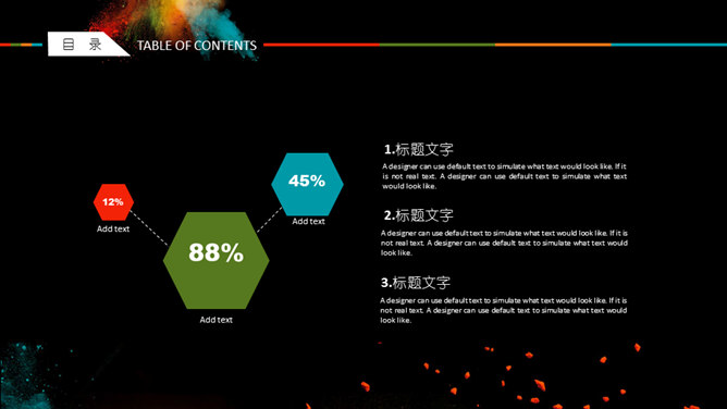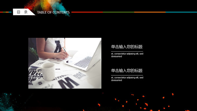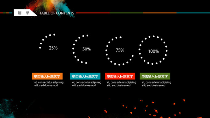 创意彩色艺术炫酷PPT模板。一套创意炫酷幻灯片模板,彩色喷射粉末艺术效果设计,黑色背景,动态播放。