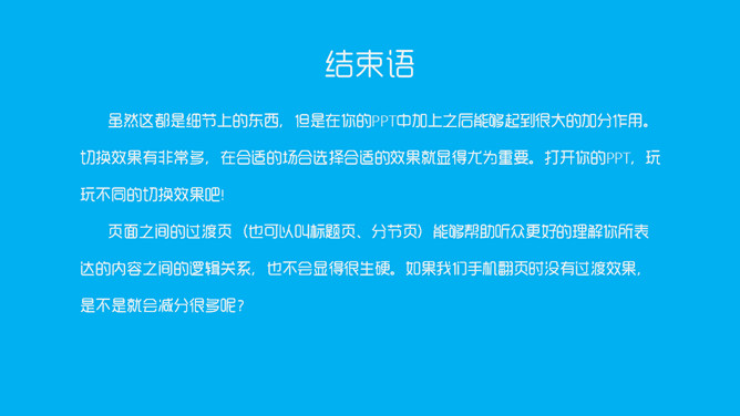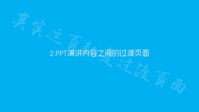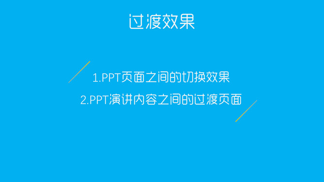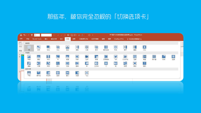 PPT过渡效果过渡页制作教程。何谓过渡效果?一是PPT页面之间的切换效果,二是PPT演讲内容之间的过渡页面。增加切换效果之后,可以让你的PPT切换时显得更加自然。一般以即将演讲的内容(小标题)单独成一页,即为过渡页。虽然这都是细节上的东西,但是在你的PPT中加上之后能够起到很大的加分作用。切换效果有非常多,在合适的场合选择合适的效果就显得尤为重要。打开你的PPT,玩玩不同的切换效果吧!