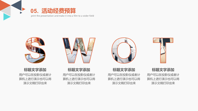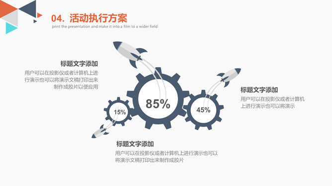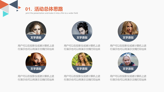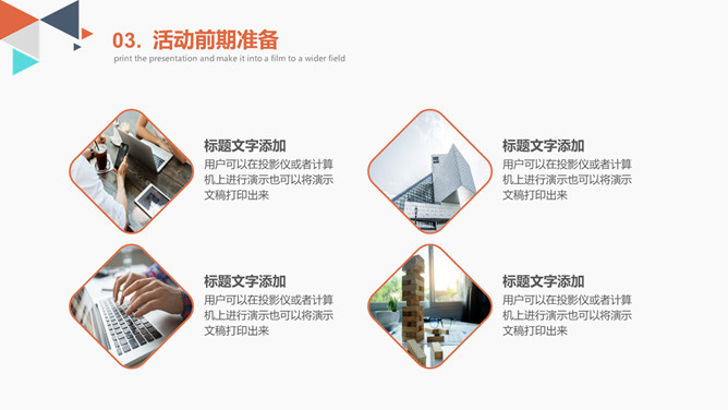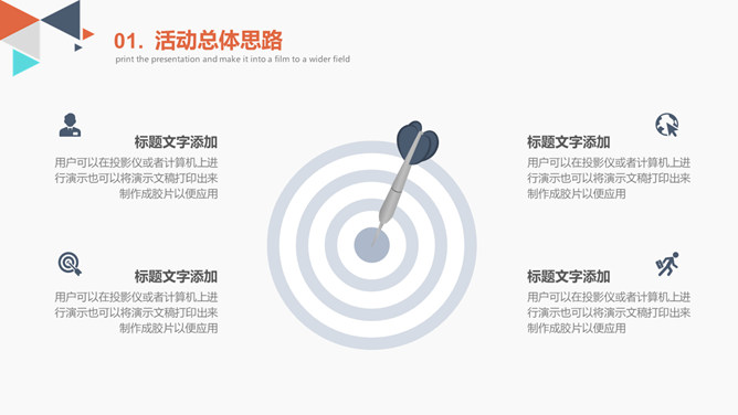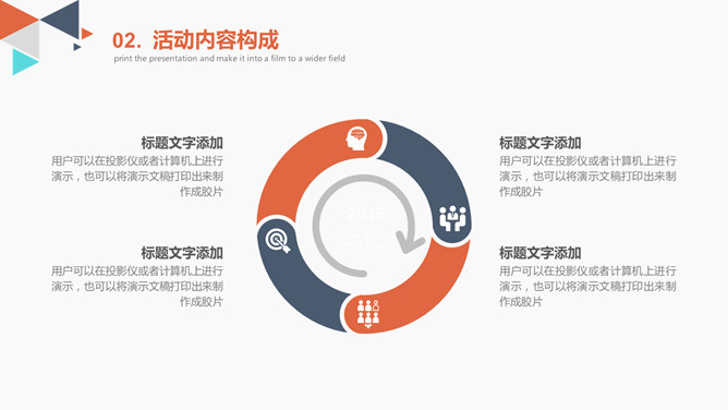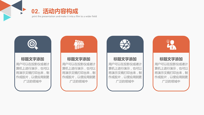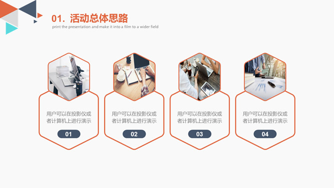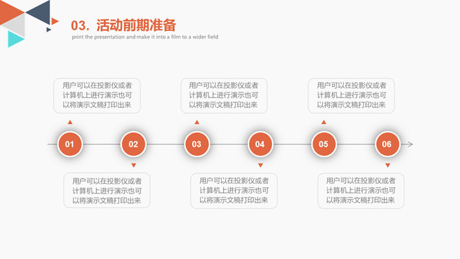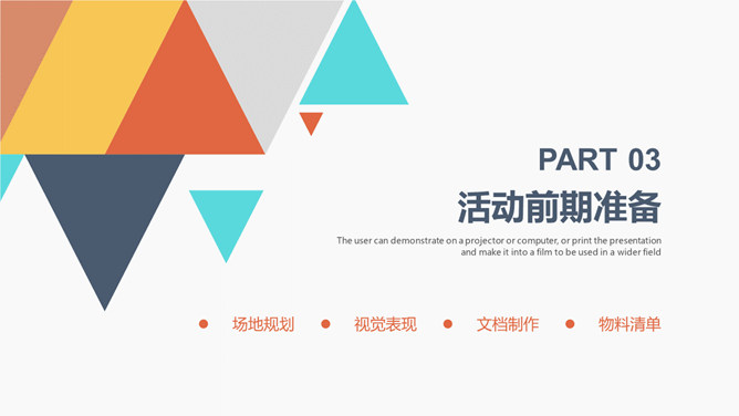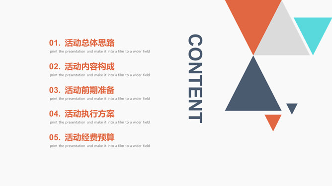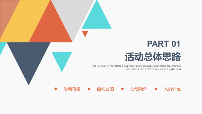 多彩三角活动策划方案PPT模板。一套简约使用的活动策划方案幻灯片模板,多彩三角形装饰,动态播放。