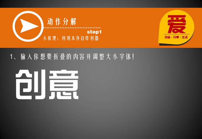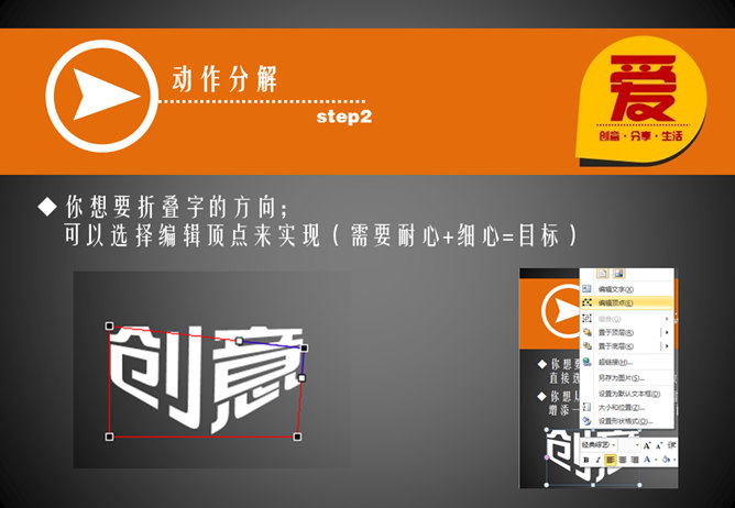 立体折叠字效果制作PPT教程。步骤:输入你想要折叠的内容并调整大小字体!你想要从创意中间两字折叠;直接选择绘图工具/文字效果/弯曲。你想从创字中间折叠,则需要在其中文本增添一字并填充无色。你想要折叠字的方向;可以选择编辑顶点来实现(需要耐心+细心=目标)
