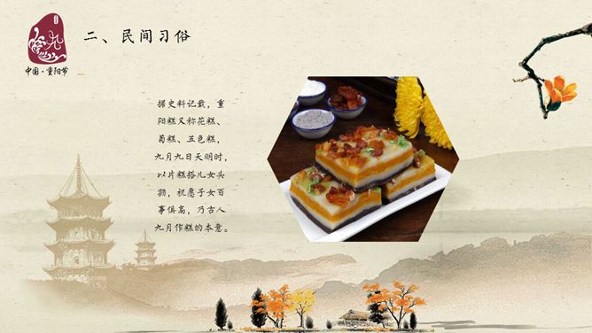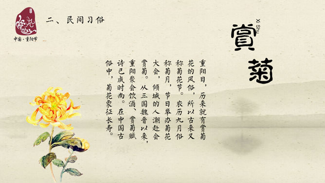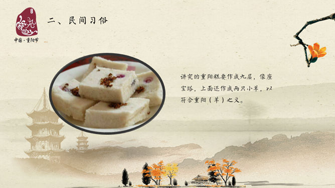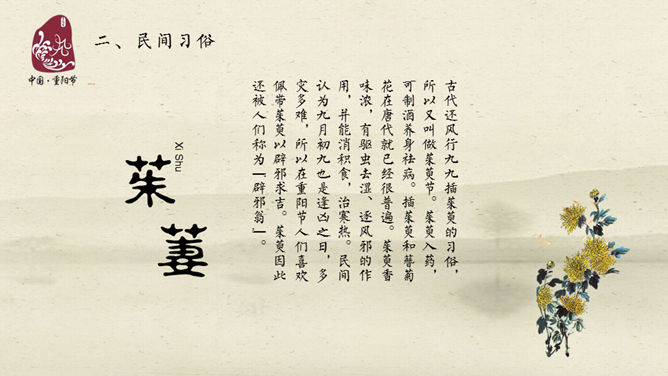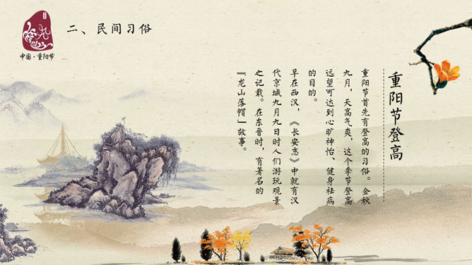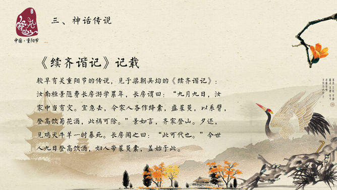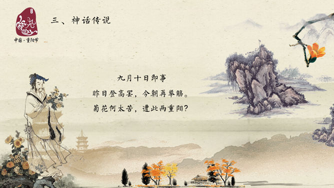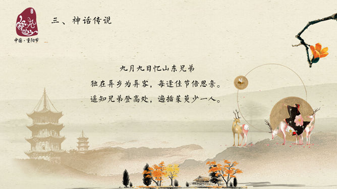 复古九九重阳节介绍PPT模板。一套重阳节主题幻灯片模板,古典复古设计风格,建议安装字体: