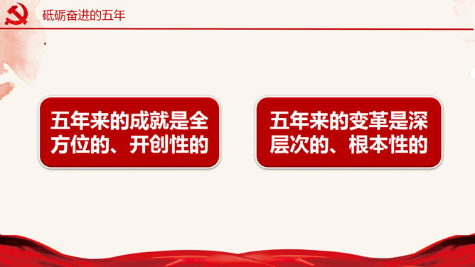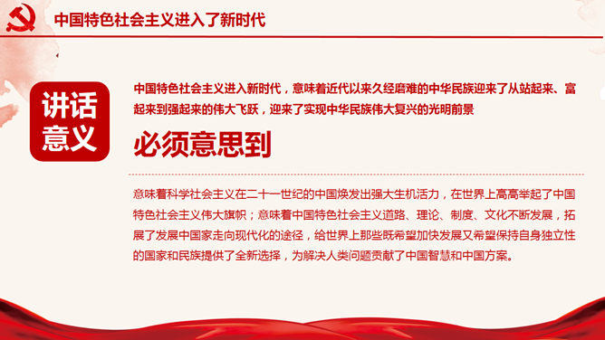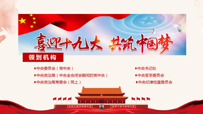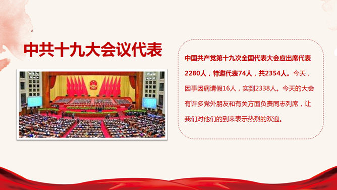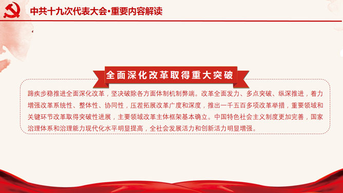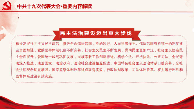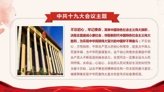 十九大报告解读宣讲PPT模板。一套十九大主题幻灯片模板,适合制作十九大报告解读宣讲报告课件。