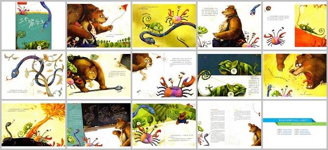 《三个笨学生》绘本故事PPT。当当当,钟声响了,熊老师要开始上课了。今天来了三个学生,他们是螃蟹、变色龙和小花蛇。熊老师开始讲课了:我今天给大家讲什么是前、什么是后。你们看,肚子朝哪,哪就是前;后背朝哪,哪就是后。螃蟹和变色龙说:我们知道了,肚子朝哪里,哪里就是前,背朝哪里,哪里就是后。那么地面是前,天上就是后了。小花蛇这时绕在树上