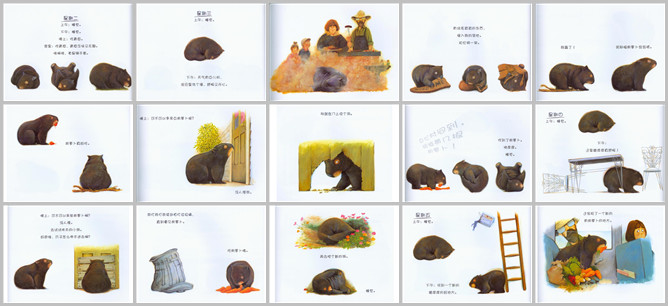 《袋熊日记》绘本故事PPT。星期一:上午睡觉。下午睡觉。晚上吃青草。挠痒痒。夜里吃青草。星期二:上午睡觉。下午睡觉。晚上吃青草。夜里吃青草,青草乏味又无聊。挠啊挠,老是够不着。星期三:上午睡觉。下午天气有点儿阴,泥巴里洗个澡,舒服又开心。有块毛茸茸的东西,侵入我的领地。和它拼了一架。我赢了,奖励根胡萝卜尝尝吧。胡萝卜真好吃。晚上可以不可以多来点胡萝卜呢