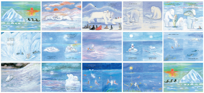《浮冰上的小熊》绘本故事PPT。我的小熊,你真的好可爱,你永远都不知道我们有多爱你。今天,我们要悠闲的在浮冰上散步,你将会碰到很多我们的朋友,他们可是迫不及待的想认识你呢。小熊,看好了,我教你怎么捉鱼。妈妈,你看,我也会了。哇好大一条鱼,妈妈,你真厉害。小熊看着妈妈从浮冰的洞里抓出一条美丽的鳟鱼,真的好佩服。过了一会,小熊看见一只小动物好奇的从洞里探出头来
