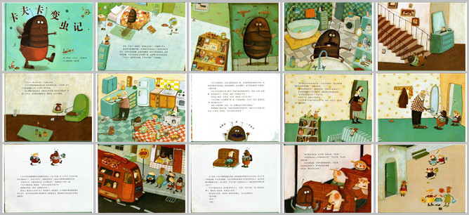 《卡夫卡变虫记》绘本故事PPT。早晨,卡夫卡醒来,发现自己变成了一只大甲虫。他走到镜子跟前,盯着镜子里的自己,棕紫色的甲虫深紫,又大又黑的虫眼,天线一样的触角,还有六条毛茸茸的细细长长的虫腿。卡夫卡坐在床上仔细想,这种事以前从前从没发生过。爸爸喊:卡夫卡,赶紧穿好衣服,下来吃饭。卡夫卡用六条腿拖着笨重的身子,急急忙忙的跑进卫生间。他的甲虫爪子踩在瓷砖上