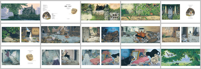 《老鼠小心》绘本故事PPT。无人打开的院门锈迹斑斑,每当风吹过,总是发出嘎吱的轻叹。石墙上爬满了藤蔓,就在碎裂的缝隙间,有只小老鼠正在窥探。如日落般安静,一个影子悄悄潜行。无人叩响的房门左摇右晃,每当风呼啸,仿佛就要倾倒。穿过木门残破的一角,有只小老鼠正在东张西望。沿着杂乱的小径,一个影子悄悄潜行。无人经过的玄关幽暗荒凉,每当风低唱,长长的蛛网摇摇晃晃
