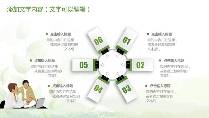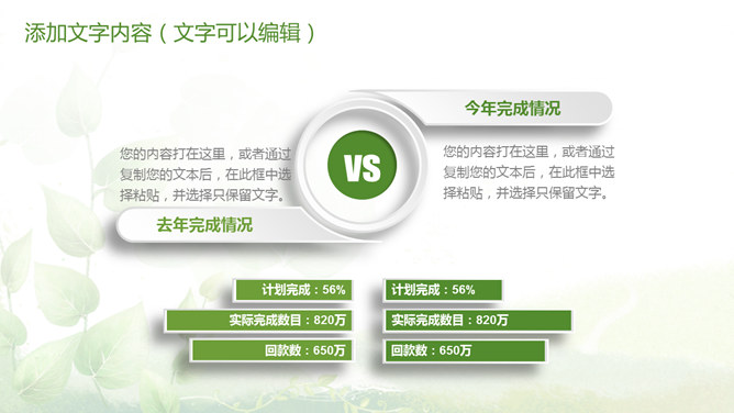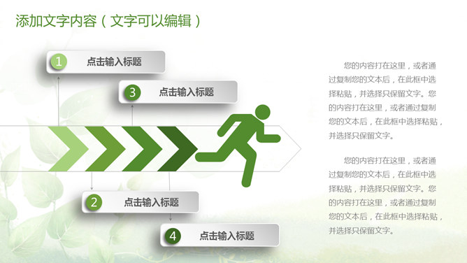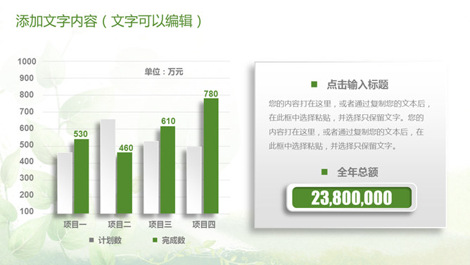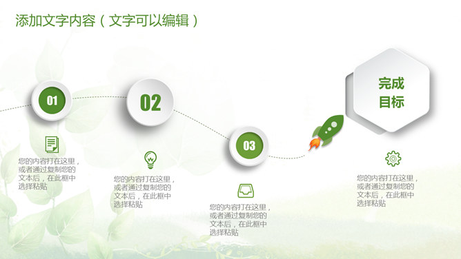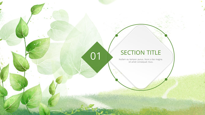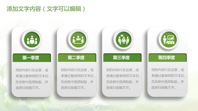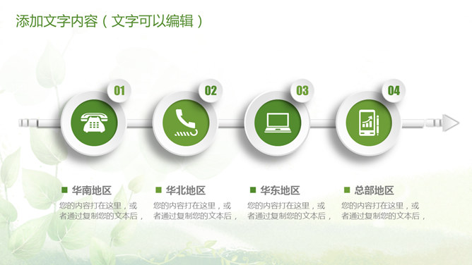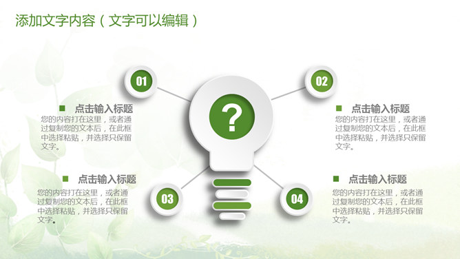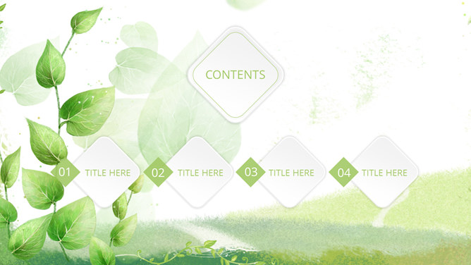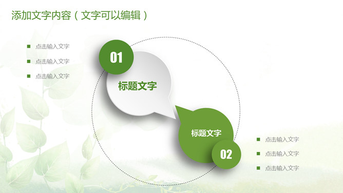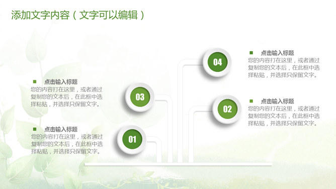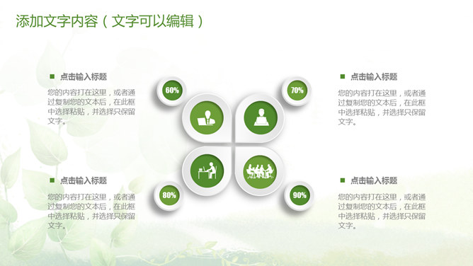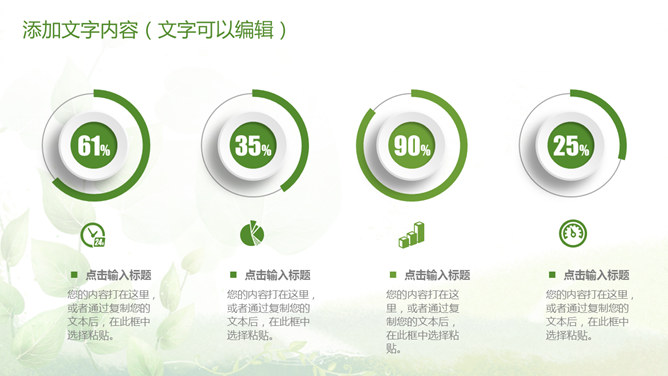 清新绿色多功能通用PPT模板。一套多功能幻灯片模板,微立体视觉效果,植物背景,清新绿色配色,通用性强。