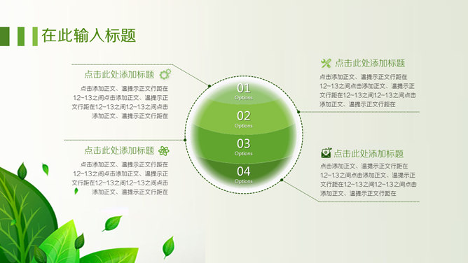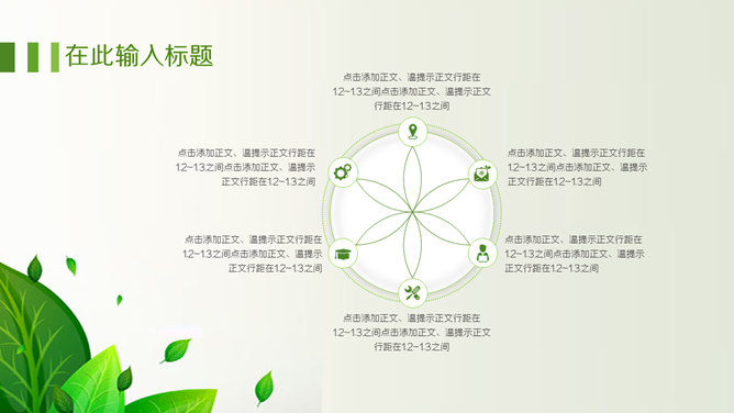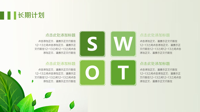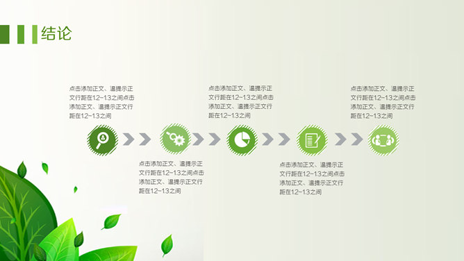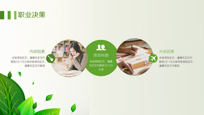 绿色职业生涯规划PPT模板。一套职业生涯规划幻灯片模板,清新绿叶装饰,包括自我认知、职业认知、职业决策、结论、计划与途径几个部分。