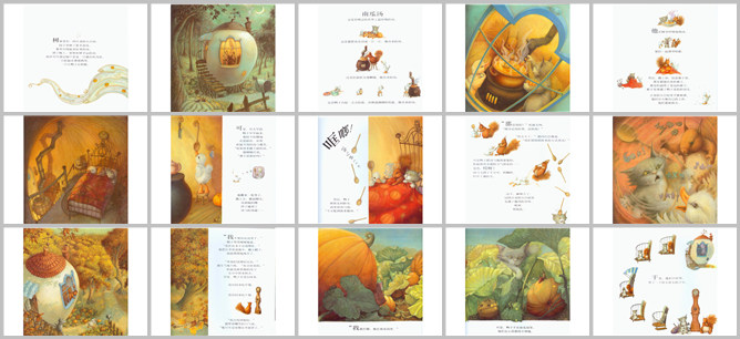 《南瓜汤》绘本故事PPT。树林里有一间古老的小白屋,园子里种了很多南瓜。那里有闻起来好香的汤。到了晚上,如果你够幸运,或许能够透过窗户看见一只松鼠在弹斑鸠琴,一只猫在吹风笛、一只小鸭子在唱歌。这是你喝过的世界上最好喝的汤。这是猫把南瓜切成一片一片,做出来的汤。这是松鼠把水搅啊搅,做出来的汤。这是鸭子舀起一点点的盐,再倒进刚刚的好的盐,做出来的汤
