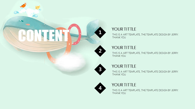 精美可爱卡通鲸鱼PPT模板。一套精美卡通风格幻灯片模板,可爱卡通鲸鱼背景,适合儿童教学课件使用。