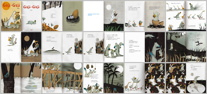 《Guji-Guji》绘本故事PPT。有一颗蛋在地上滚。滚过树林,滚过花园。又从斜坡滑了下去。鸭妈妈并没有发现有什么不对劲,继续孵着蛋。一天,蛋破了。第一颗蛋孵出的是一只有蓝点的小鸭,叫蜡笔。第二颗是一只有条纹的小鸭,叫斑马。第三颗是一只黄色的小鸭,叫月光。第四颗孵出的是一只全身绿色的小怪鸭,嘴里还一边不停的发出咕叽咕叽的叫声,所以就叫Guji Guji。鸭妈妈教小鸭们划水