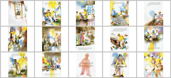 《歌舞爷爷》绘本故事PPT。爷爷以前是一位歌舞艺人,曾经在综艺秀剧场的舞台上演出。我们去看他的时候,他会告诉我们一些以前的事情,过去那个美好的年代,还没有电视,是唱歌、跳舞的年代。奶奶在厨房里喊道:再过一小时就吃晚饭喽。爷爷笑着说:不知道我的踢踏鞋还能不能穿呢?然后他打开阁楼前的电灯,我们跟着他走上有点陡的木板楼梯。墙上挂着褪色的海报,是爷爷年轻时的剧照