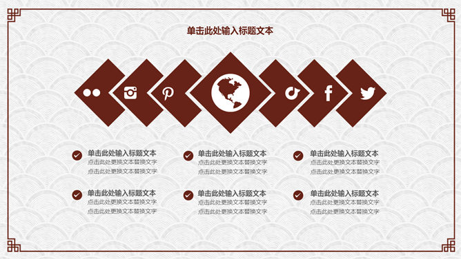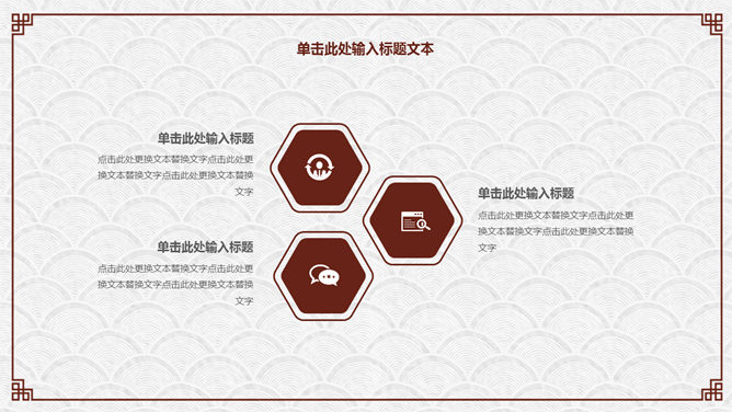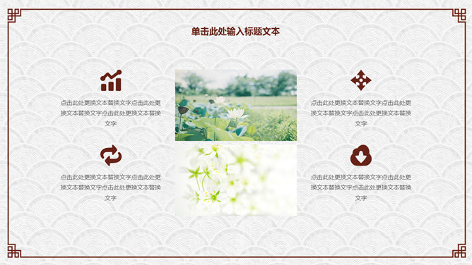 简约古典雅致文艺PPT模板。一套简约古典中国风幻灯片模板,云纹纹理背景,红色梅花装饰,回形纹边框。
