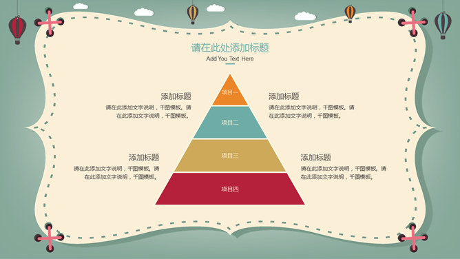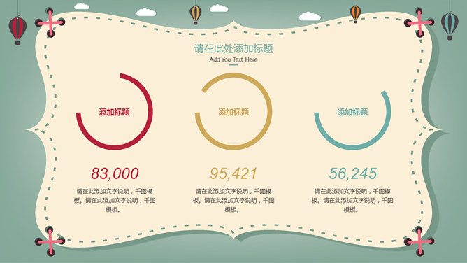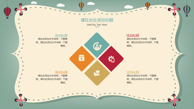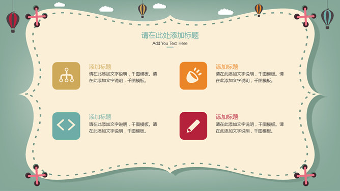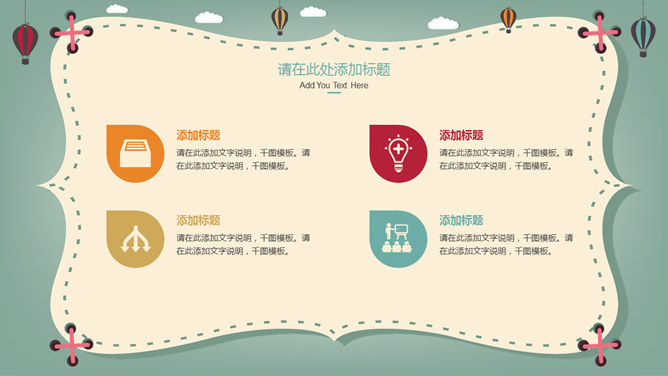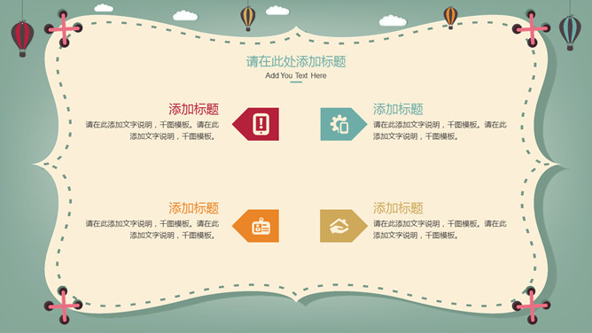 卡通热气球教学课件PPT模板。一套卡通风格件幻灯片模板,可爱卡通热气球背景,适合儿童教育教学课件使用。