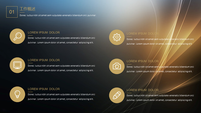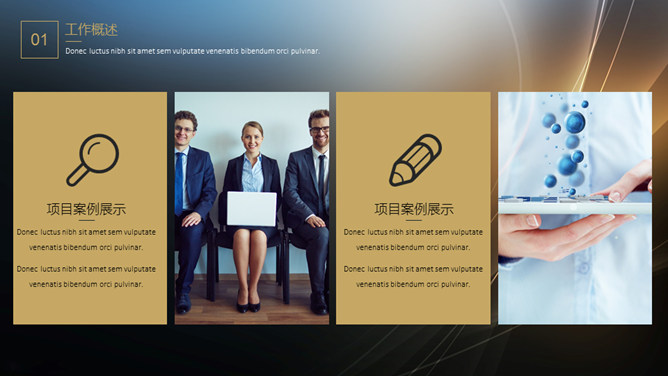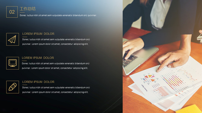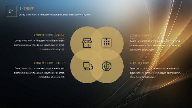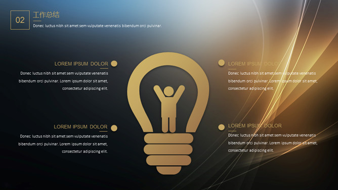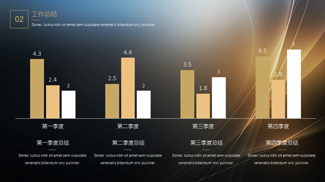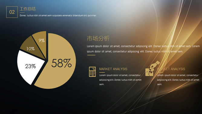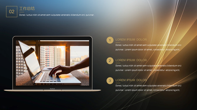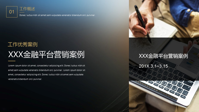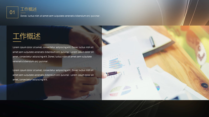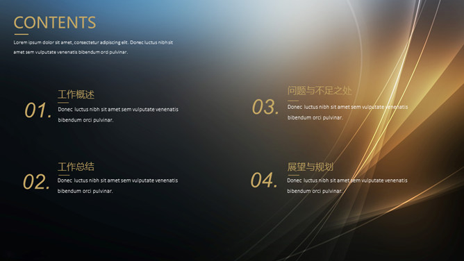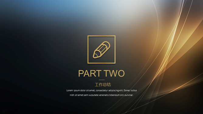简约大气黑金工作汇报PPT模板。一套简约设计工作总结汇报幻灯片模板,质感抽象纹理背景。大气黑金配色。
