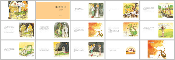 《纸袋公主》绘本故事PPT。伊丽莎白是一位美丽的公主。她住在一座城堡里,穿的都是昂贵的公主礼服。她就要和阿诺王子结婚了。不幸的是,一条火龙摧毁了她的城堡,喷火烧毁了她所有的衣服,还抓走了阿诺王子。伊丽莎白决定去追火龙,把阿诺给救回来。她四处找能穿的东西,却只找到一个没烧掉的纸袋。她就穿上纸袋去追火龙了。火龙很容易跟踪,因为它留下一条烧焦的森林小路