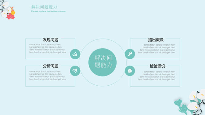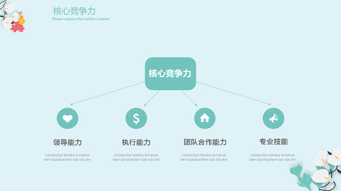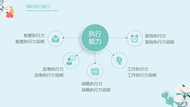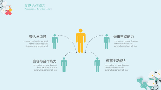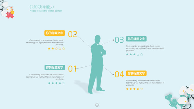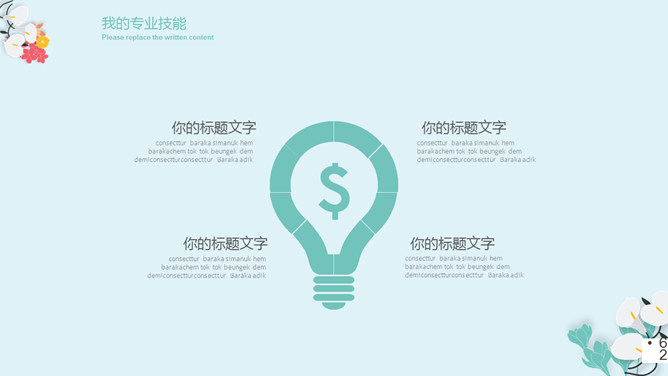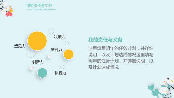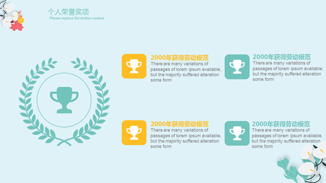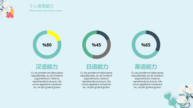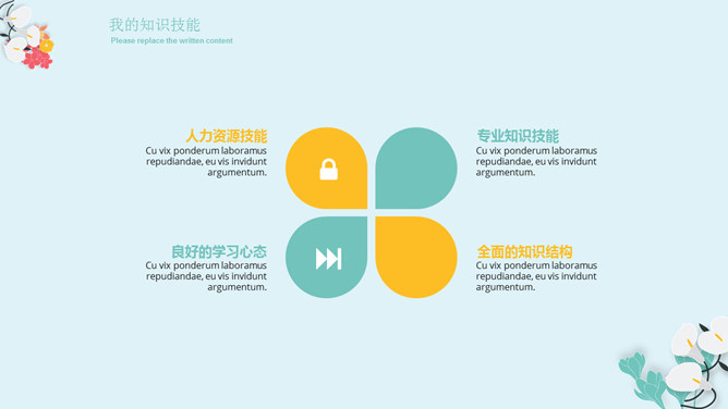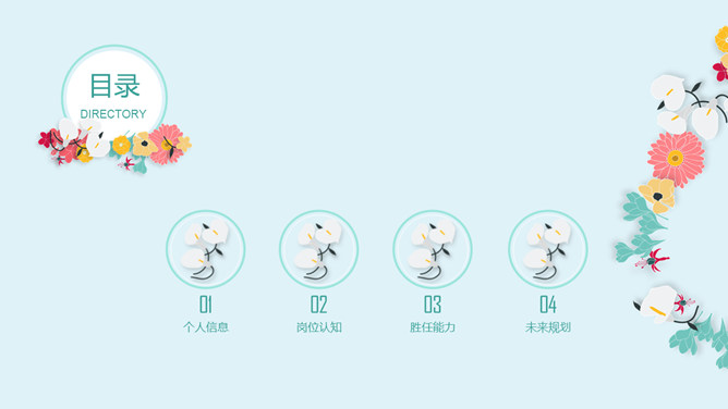 清新文艺个人简历PPT模板。一套个人竞聘求职简历幻灯片模板,清新文艺花朵装饰,框架结构完整,动态播放。