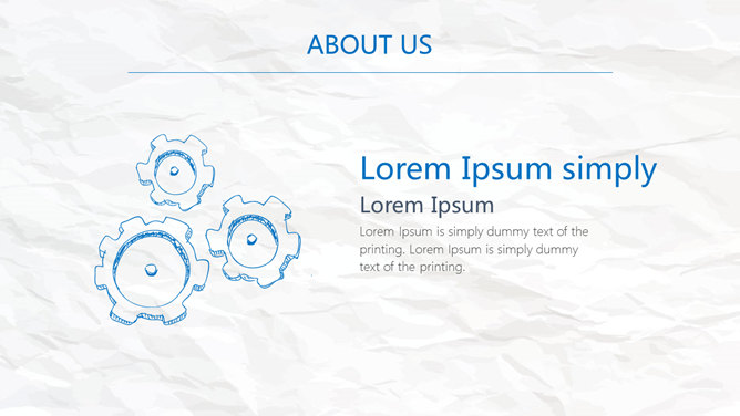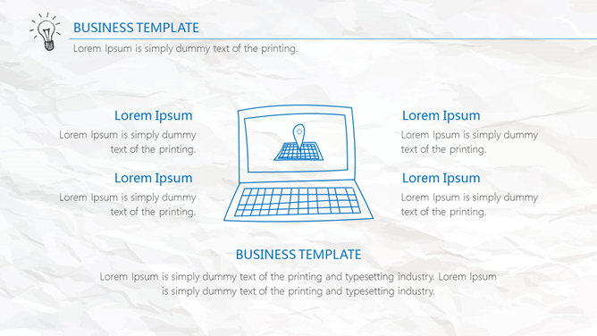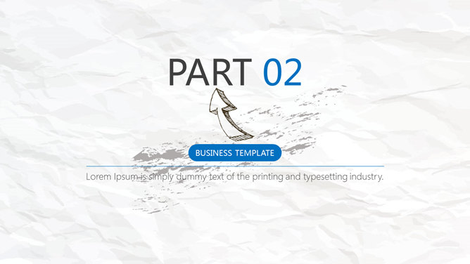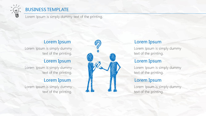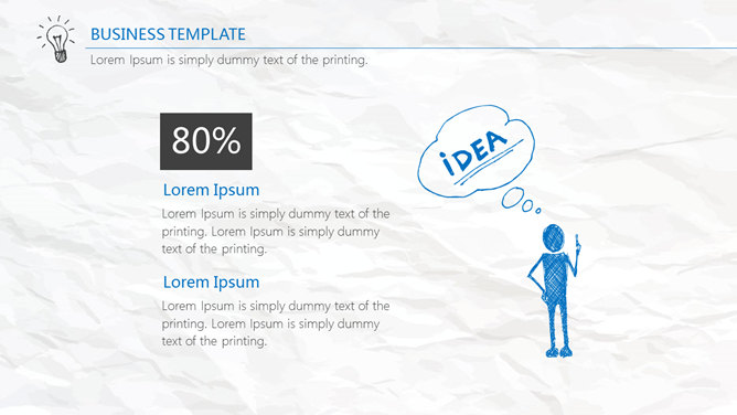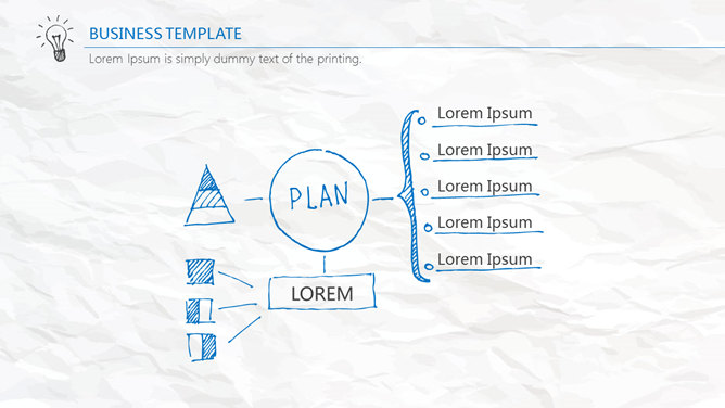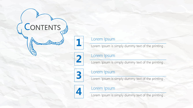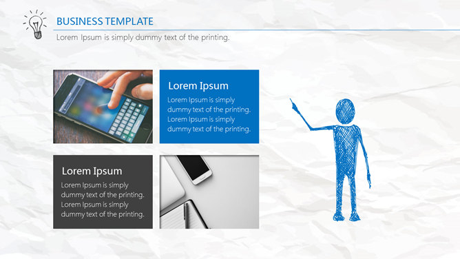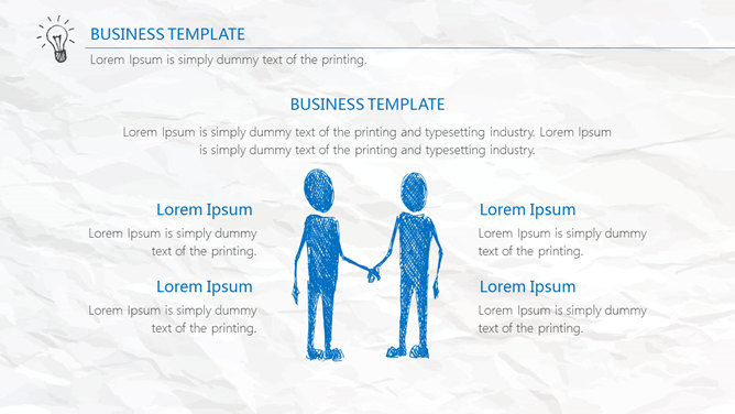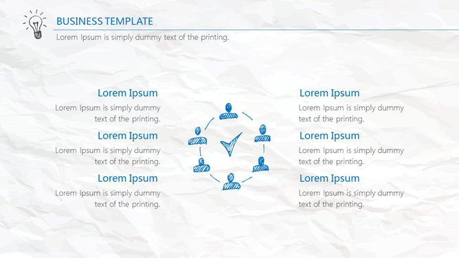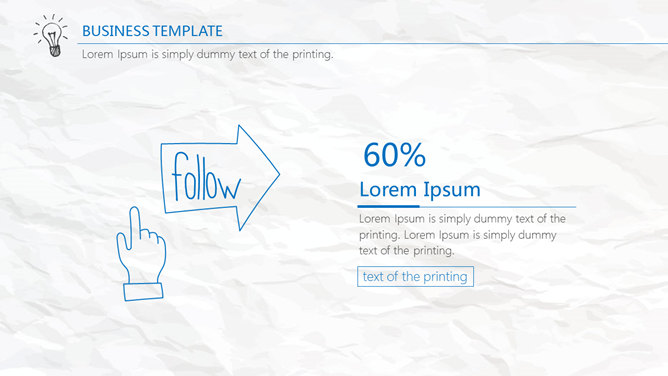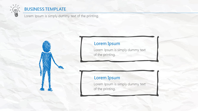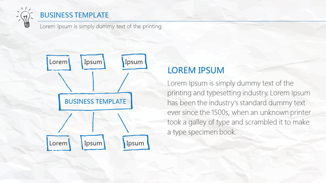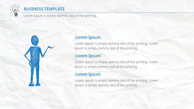 创意手绘卡通商务PPT模板。一套创意商务幻灯片模板,褶皱纸质背景,蓝色卡通手绘设计,页面类型丰富。