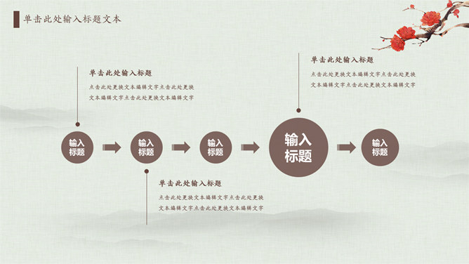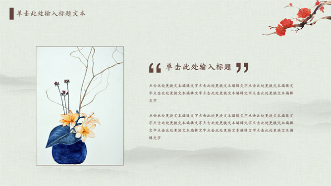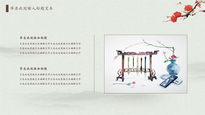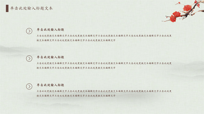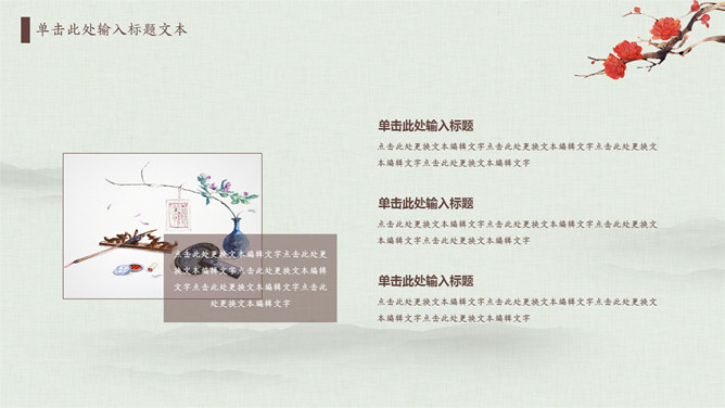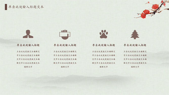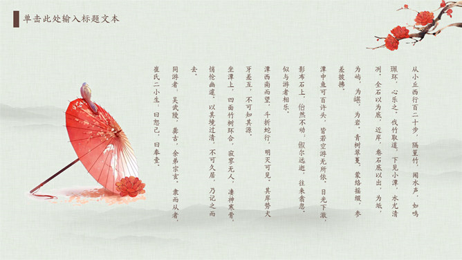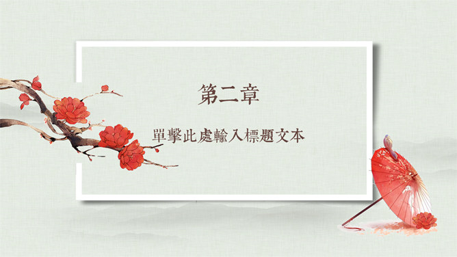 梅花红伞雅致中国风PPT模板。一套精美古典中国风幻灯片模板,布纹远山背景,梅花红伞装饰,简约雅致。建议安装字体: