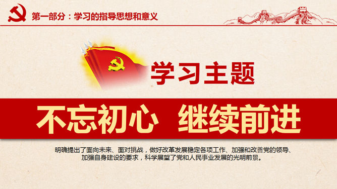 不忘初心继续前进PPT模板。一套党建工作幻灯片模板,大气精美实用的设计,适合制作党课课件。