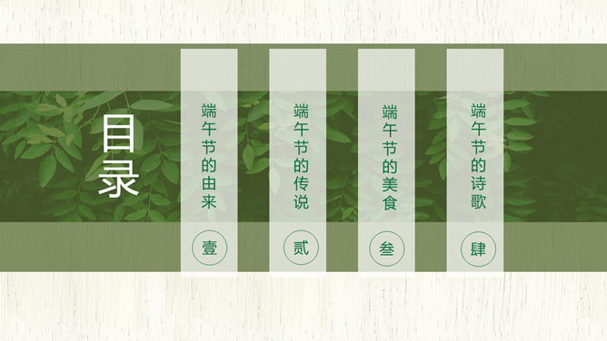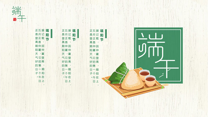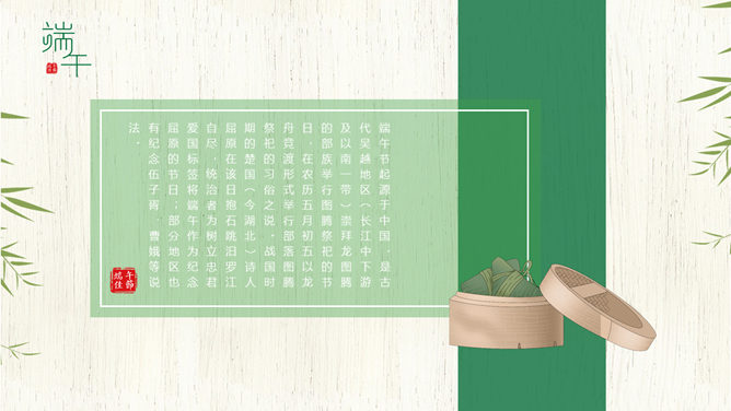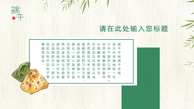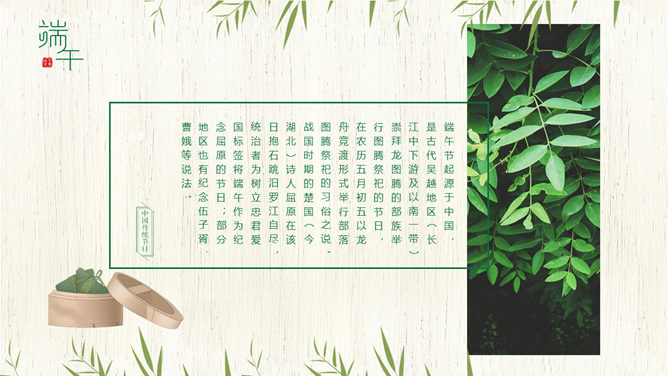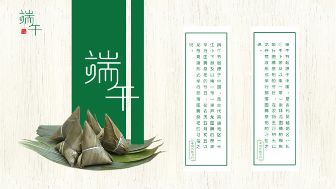 竹叶粽子清新端午节PPT模板。一套端午节主题幻灯片模板,木纹背景,粽子、竹叶装饰,清新自然。