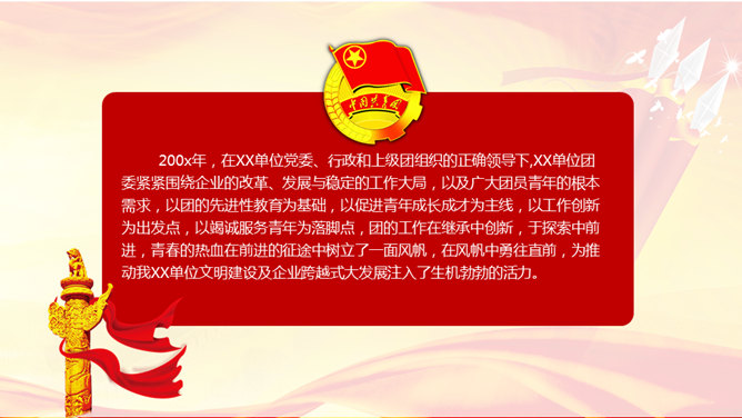 团委团支部工作汇报PPT模板。一套中国共产主义青年团团委团支部工作总结汇报报告幻灯片模板。