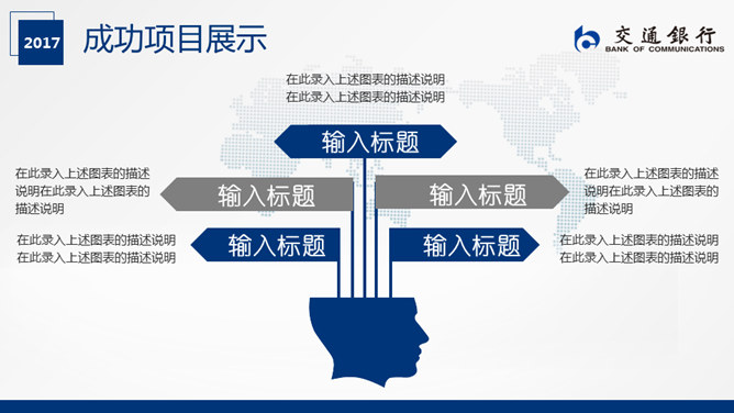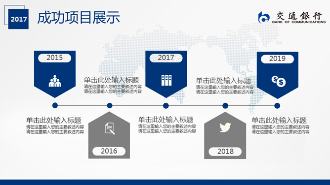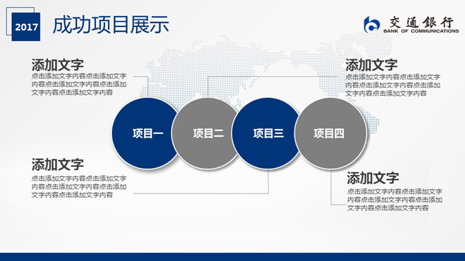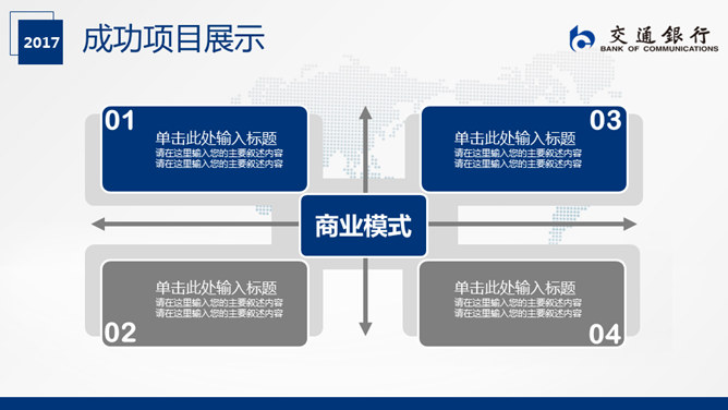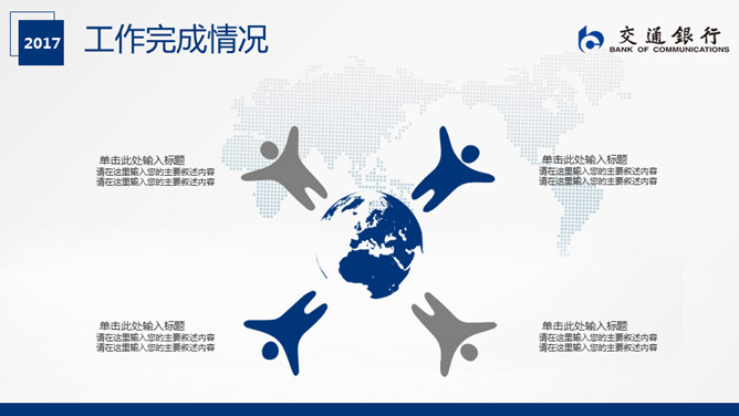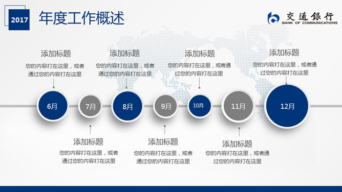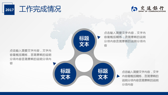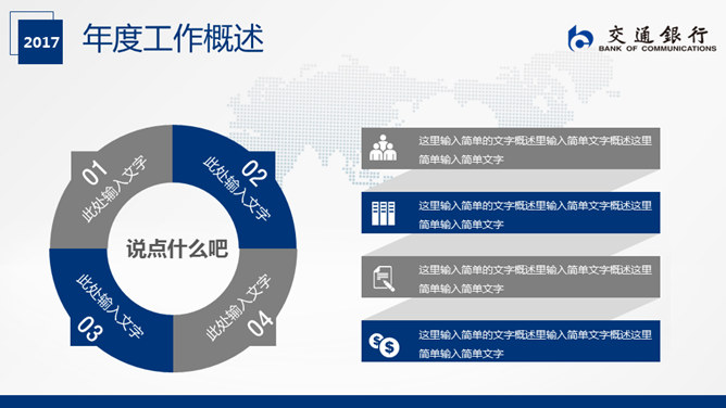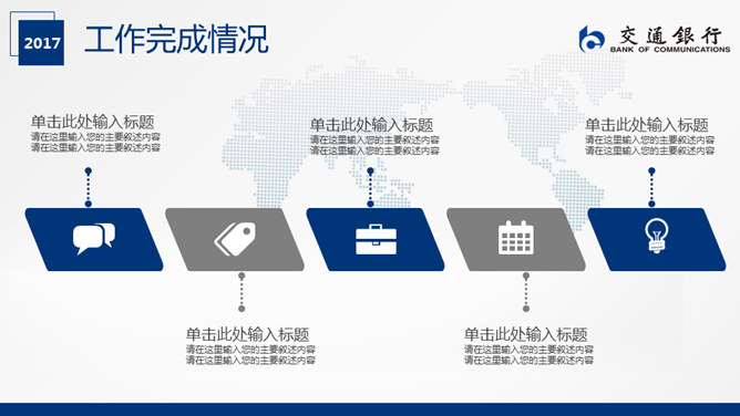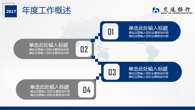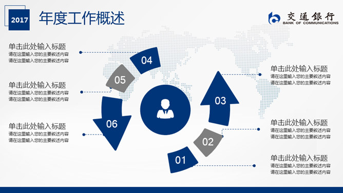 交通银行工作总结汇报PPT模板。一套交通银行专用幻灯片模板,大气蓝色主色调,多图形图表页面。