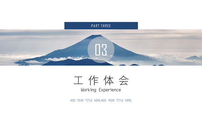 大气山峰述职报告PPT模板。一套工作汇报述职报告幻灯片模板,大气山峰背景。使用字体: