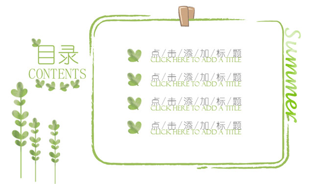 夏日小清新绿色植物PPT模板。一套夏日小清新幻灯片模板,清新手绘水彩绿色植物素材装饰,动态播放。