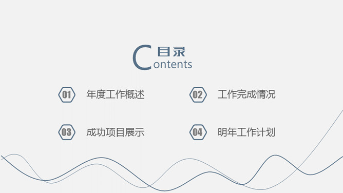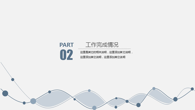 极简动态曲线通用PPT模板。一套极简设计幻灯片模板,灰色背景,蓝灰配色,动态曲线装饰,通用性强。