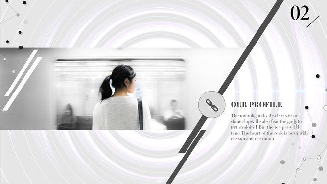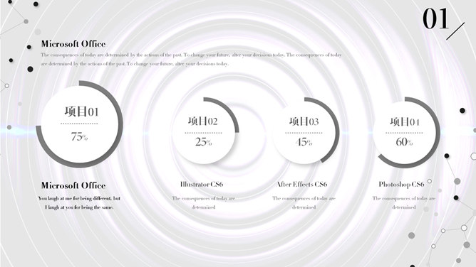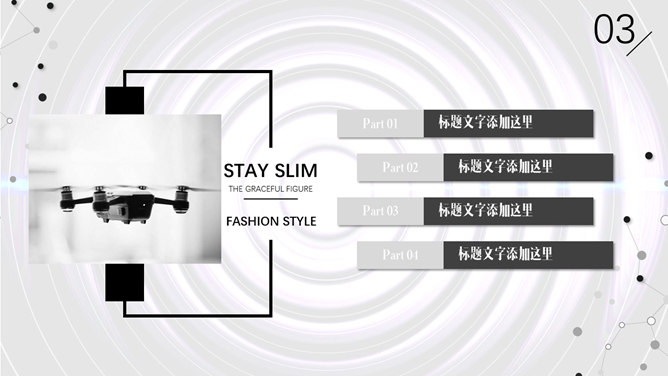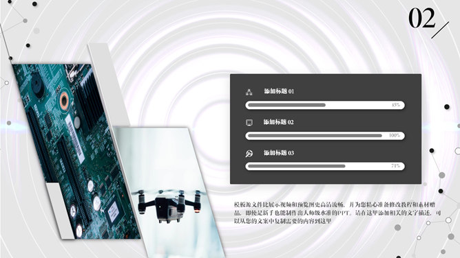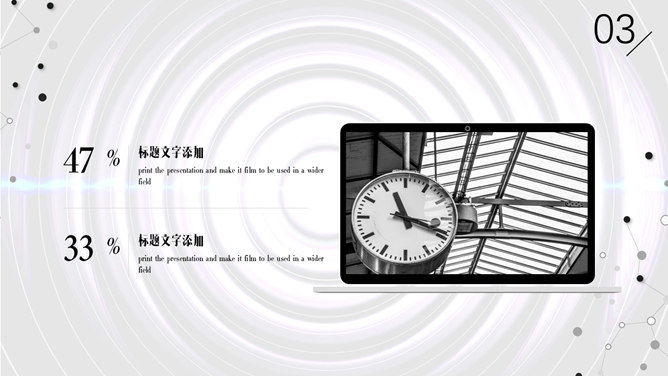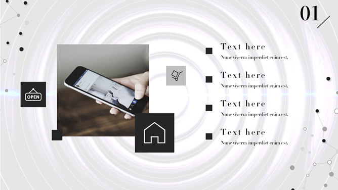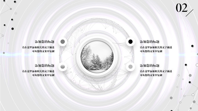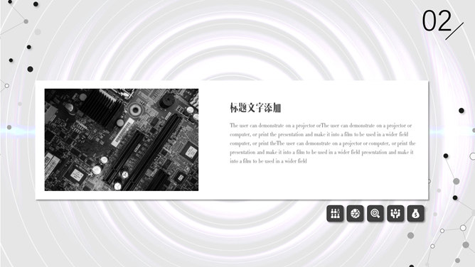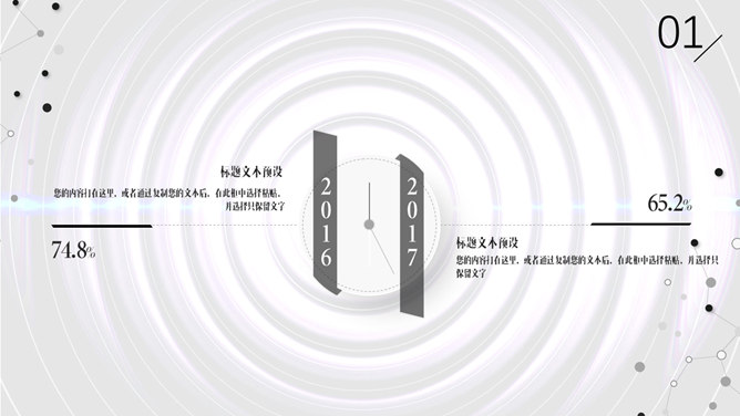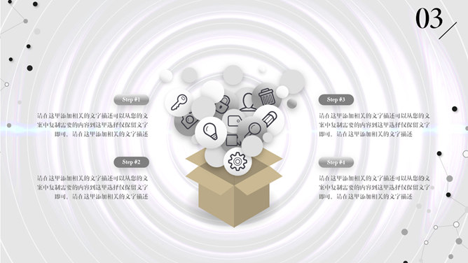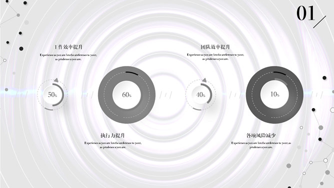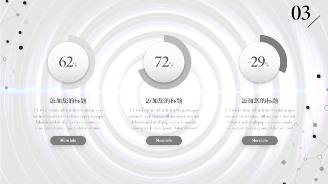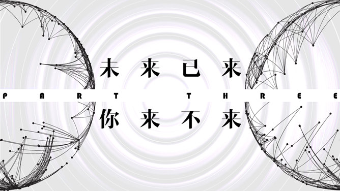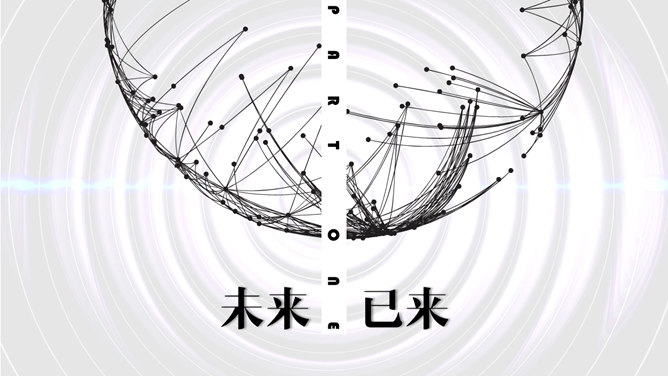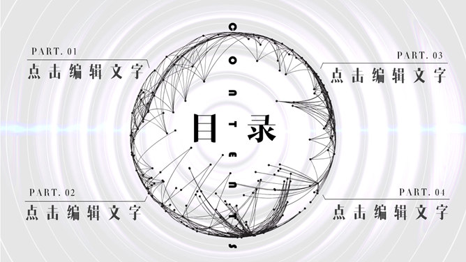 创意点线动态科技风PPT模板。一套大气创意科技风幻灯片模板,灰色同心圆背景,科技感点线粒子装饰。