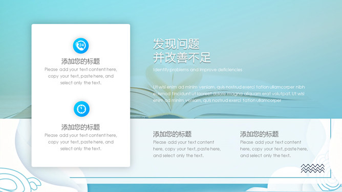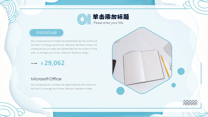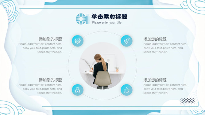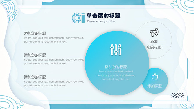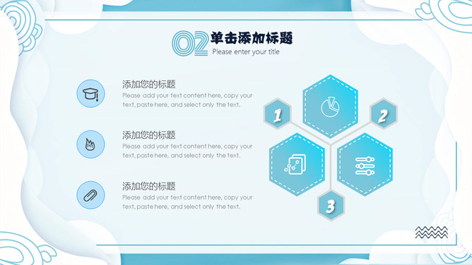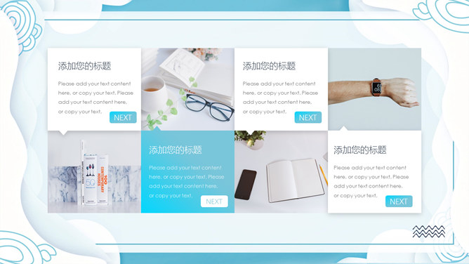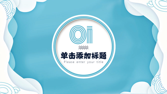 清新创意波浪边框PPT模板。一套创意设计幻灯片模板,清新蓝色配色,创意波浪边框装饰,动态播放效果。
