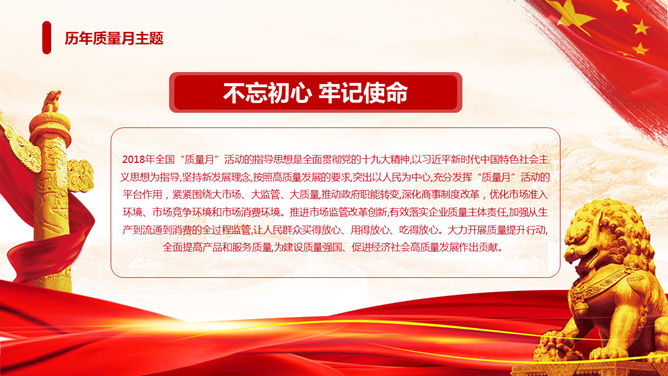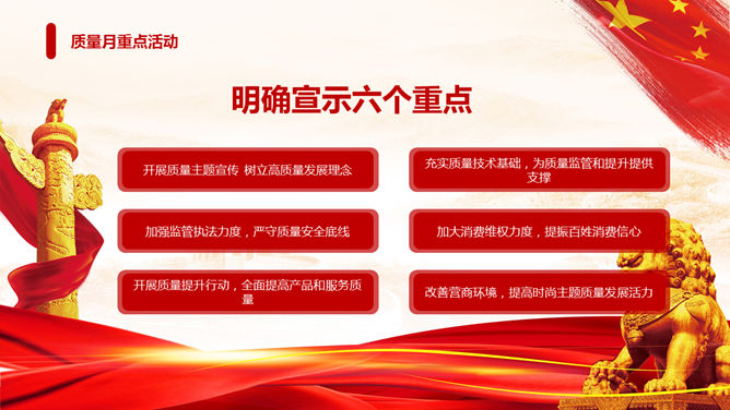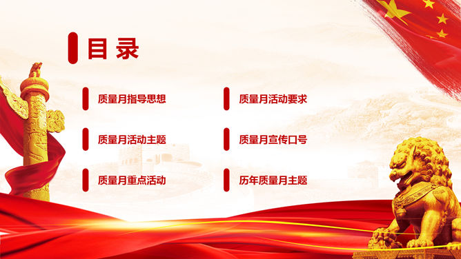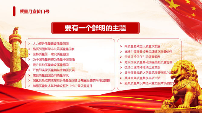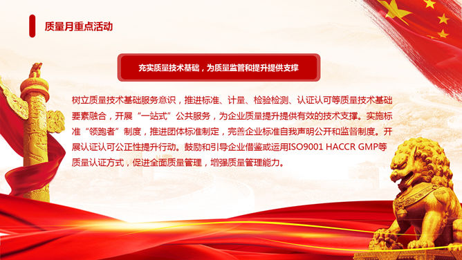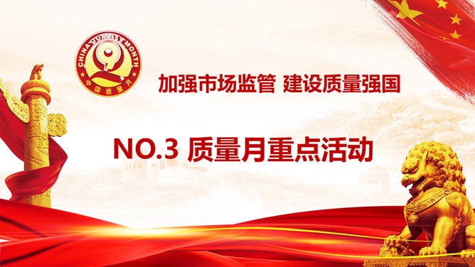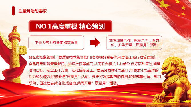 全国质量月主题活动PPT模板。一套质量月活动策划幻灯片模板,狮子、华表、国旗背景,大气红色色调。