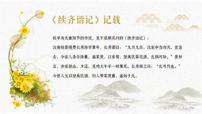 仙鹤荷花中国风重阳节PPT模板。一套传统节日重阳节主题幻灯片模板,仙鹤、荷花、菊花装饰,中国风设计风格。