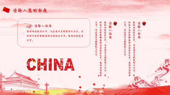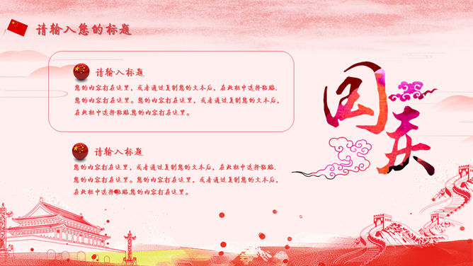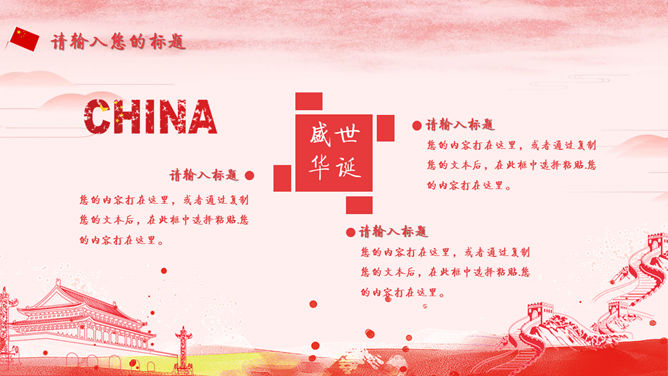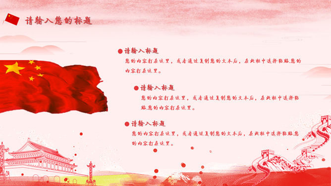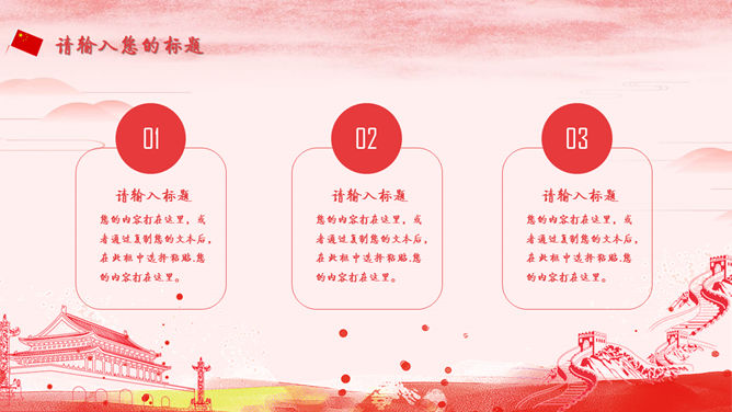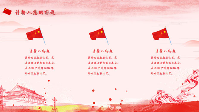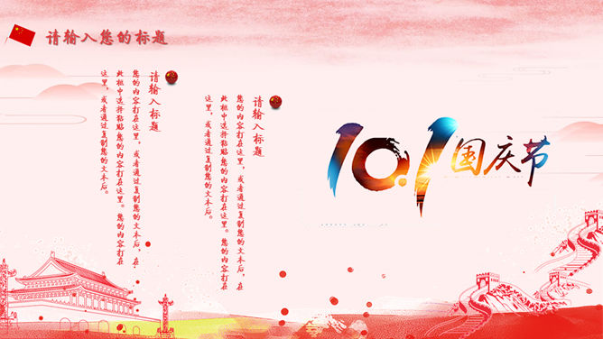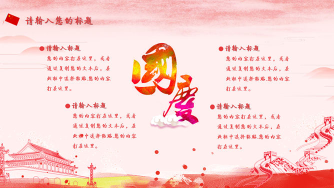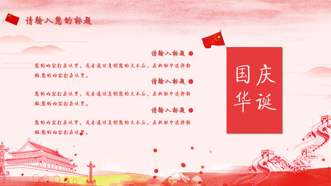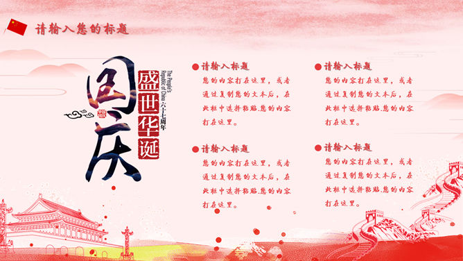 祖国万岁庆祝国庆节PPT模板。一套庆祝国庆节幻灯片模板,喜庆红色主色调,天安门、国旗、长城等元素装饰。
