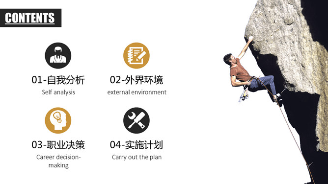 实用大学生职业生涯规划PPT模板。一套精美大学生职业生涯规划幻灯片模板,大气实用,包括自我分析、外界环境、职业决策、实施计划四个部分。