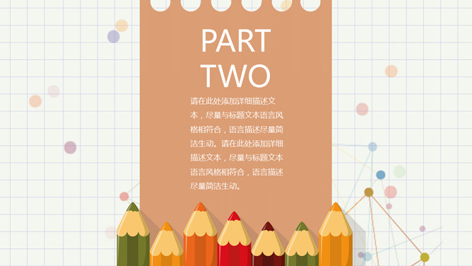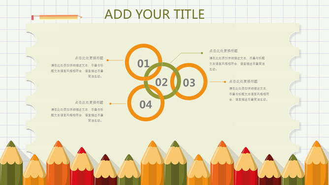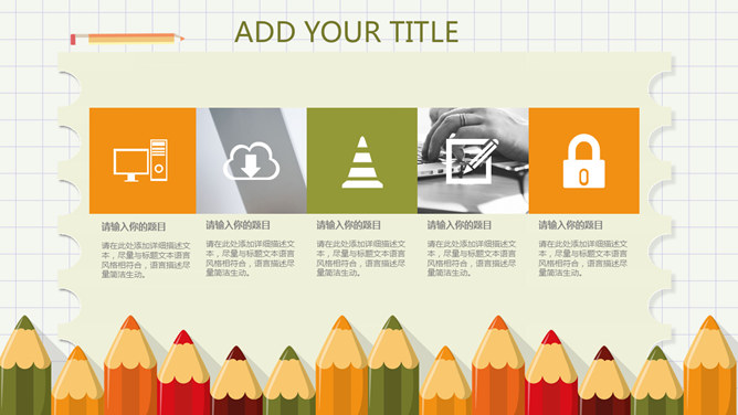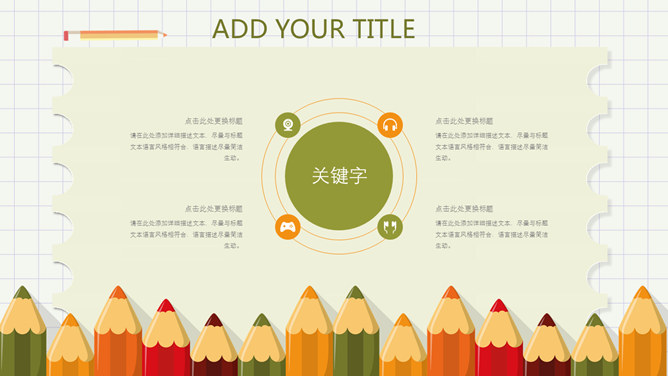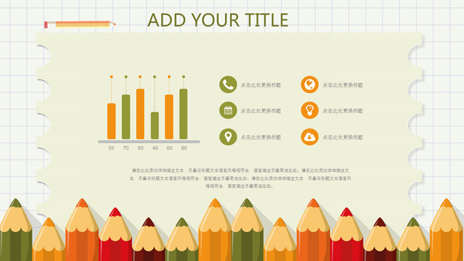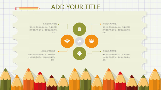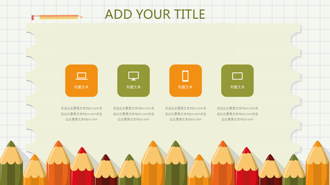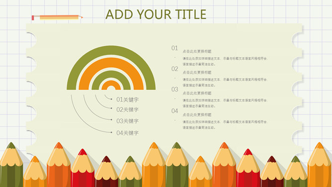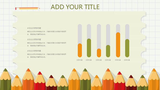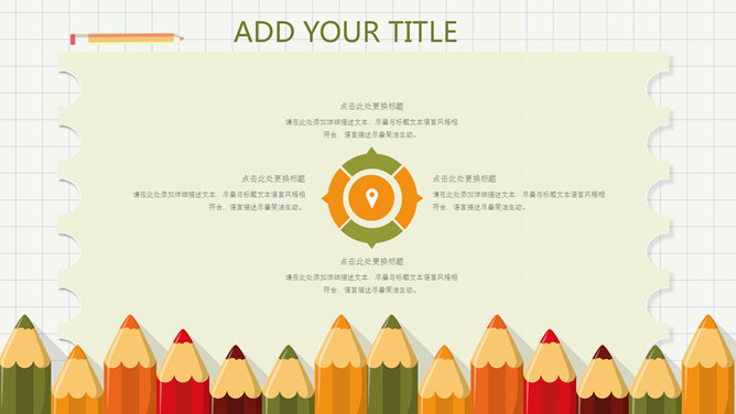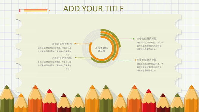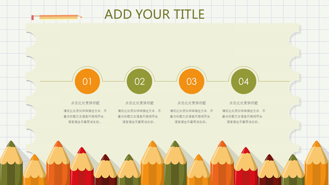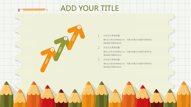可爱铅笔幼儿教学课件PPT模板。一套教育教学课件幻灯片模板,可爱彩色小铅笔装饰,适合小学幼儿教学使用。