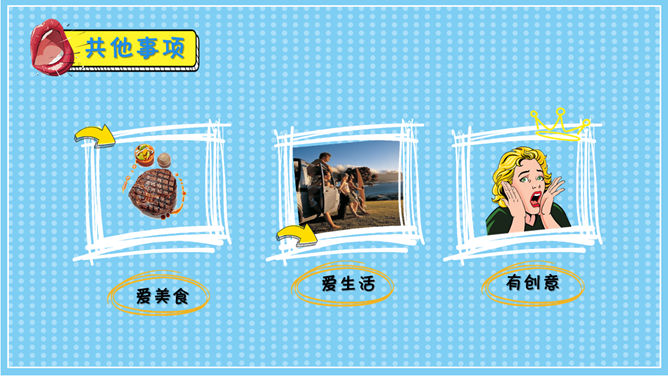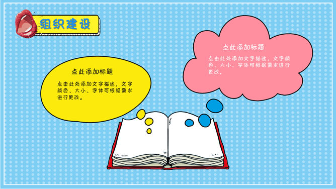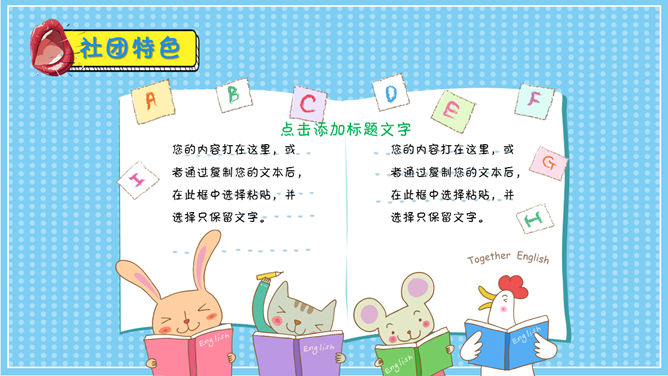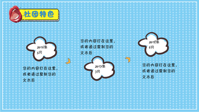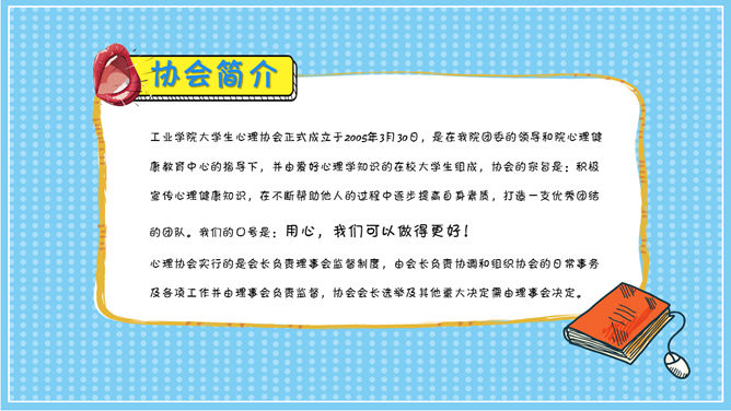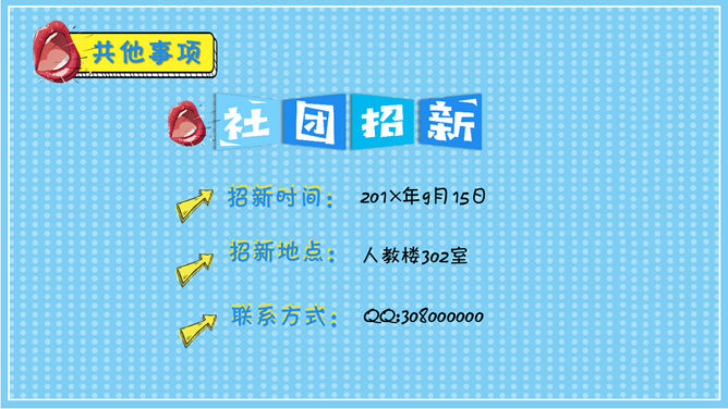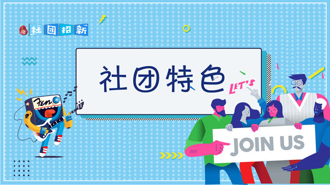 大学生社团招新宣传PPT模板。一套大学生社团招新宣传介绍幻灯片模板,卡通设计风格。使用字体: