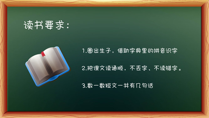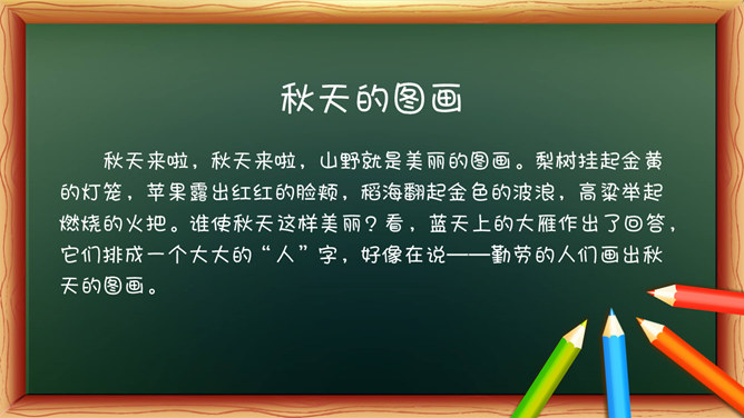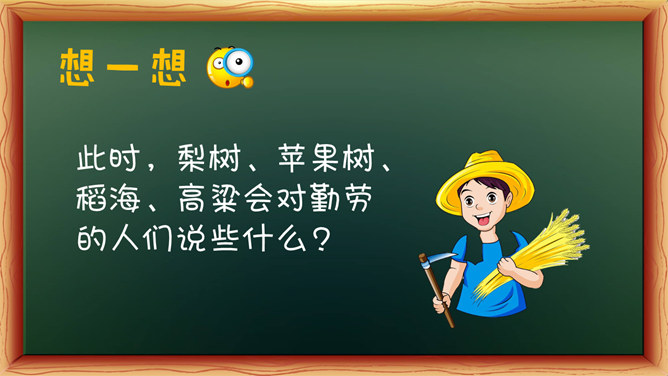 读书要求:1.圈出生子,借助字典里的拼音识字。2.把课文读通顺,不丢字、不读错字。3.数一数短文一共有几句话。想一想,勤劳的人们指哪些人?想一想,此时,梨树、苹果树、稻海、高粱会对勤劳的人们说些什么?说一说,学了课文,你想对秋天说些什么?推荐栏目:秋天的图画ppt。