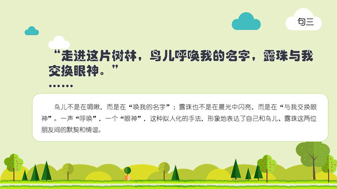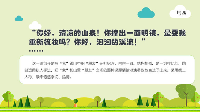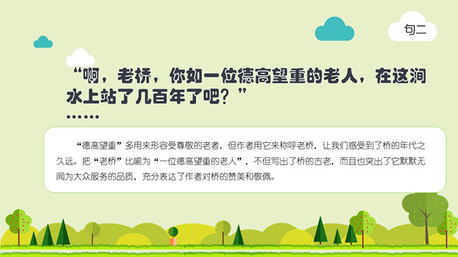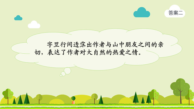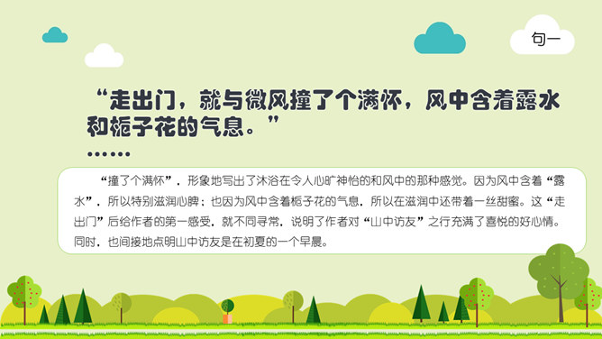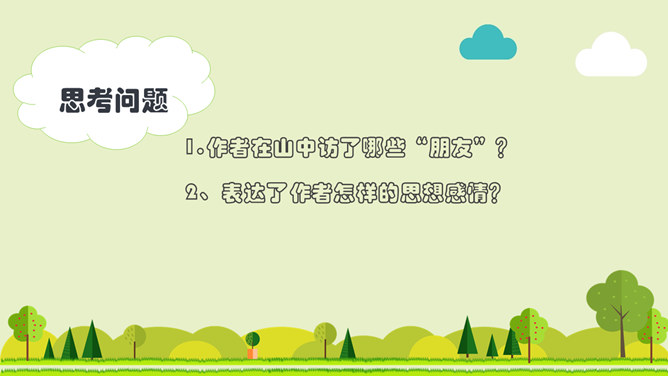 思考问题:1、作者在山中访了哪些“朋友”?2、表达了作者怎样的思想感情?“撞了个满怀”,形象地写出了沐浴在令人心旷神怡的和风中的那种感觉。因为风中含着“露水”,所以特别滋润心脾;也因为风中含着栀子花的气息,所以在滋润中还带着一丝甜蜜。这“走出门”后给作者的第一感受,就不同寻常,说明了作者对“山中访友”之行充满了喜悦的好心情。同时,也间接地点明山中访友是在初夏的一个早晨。“德高望重”多用来形容受尊敬的老者,但作者用它来称呼老桥,让我们感受到了桥的年代之久远。把“老桥”比喻为“一位德高望重的老人”,不但写出了桥的古老,而且也突出了它默默无闻为大众服务的品质,充分表达了作者对桥的赞美和敬佩。